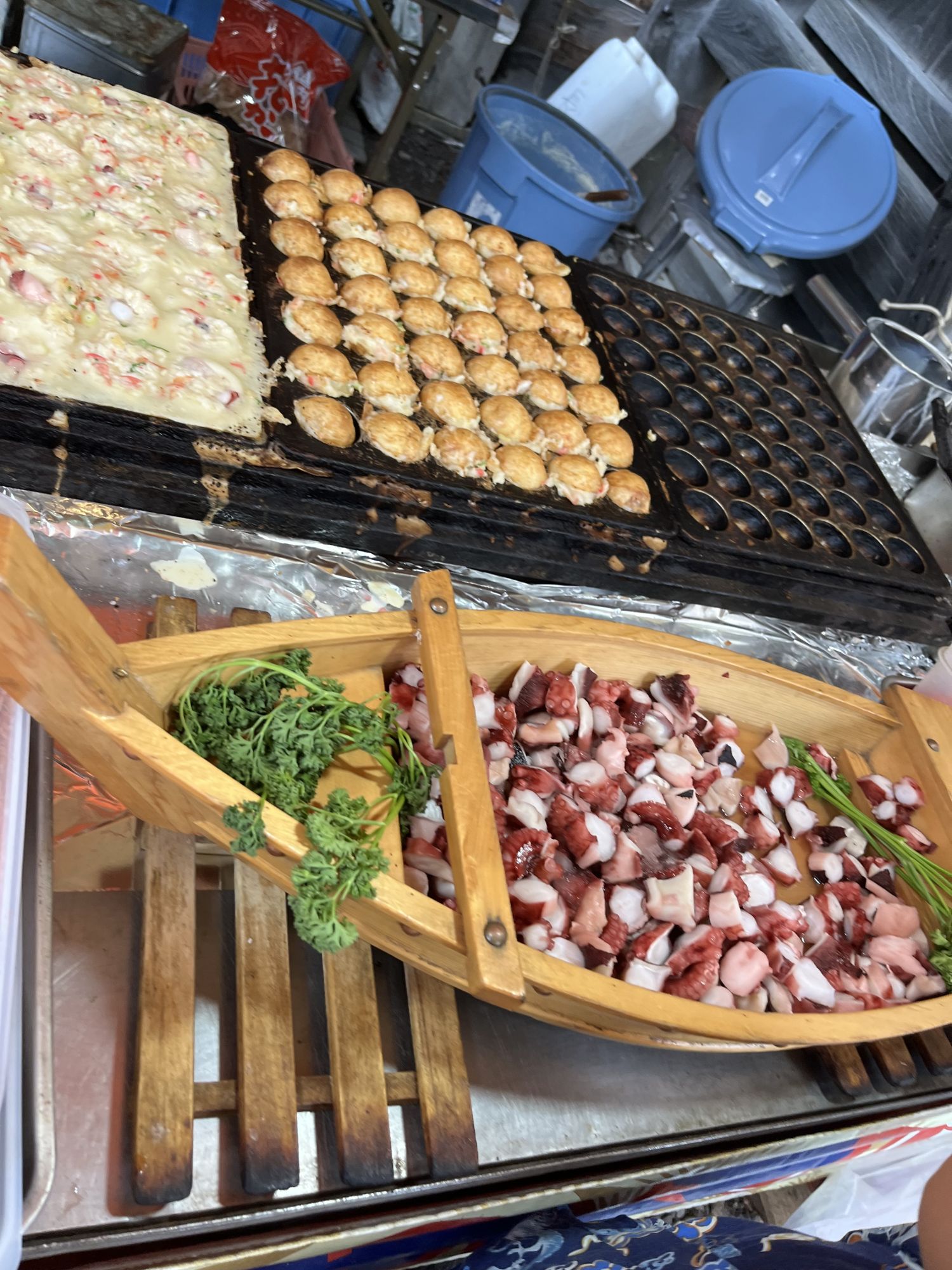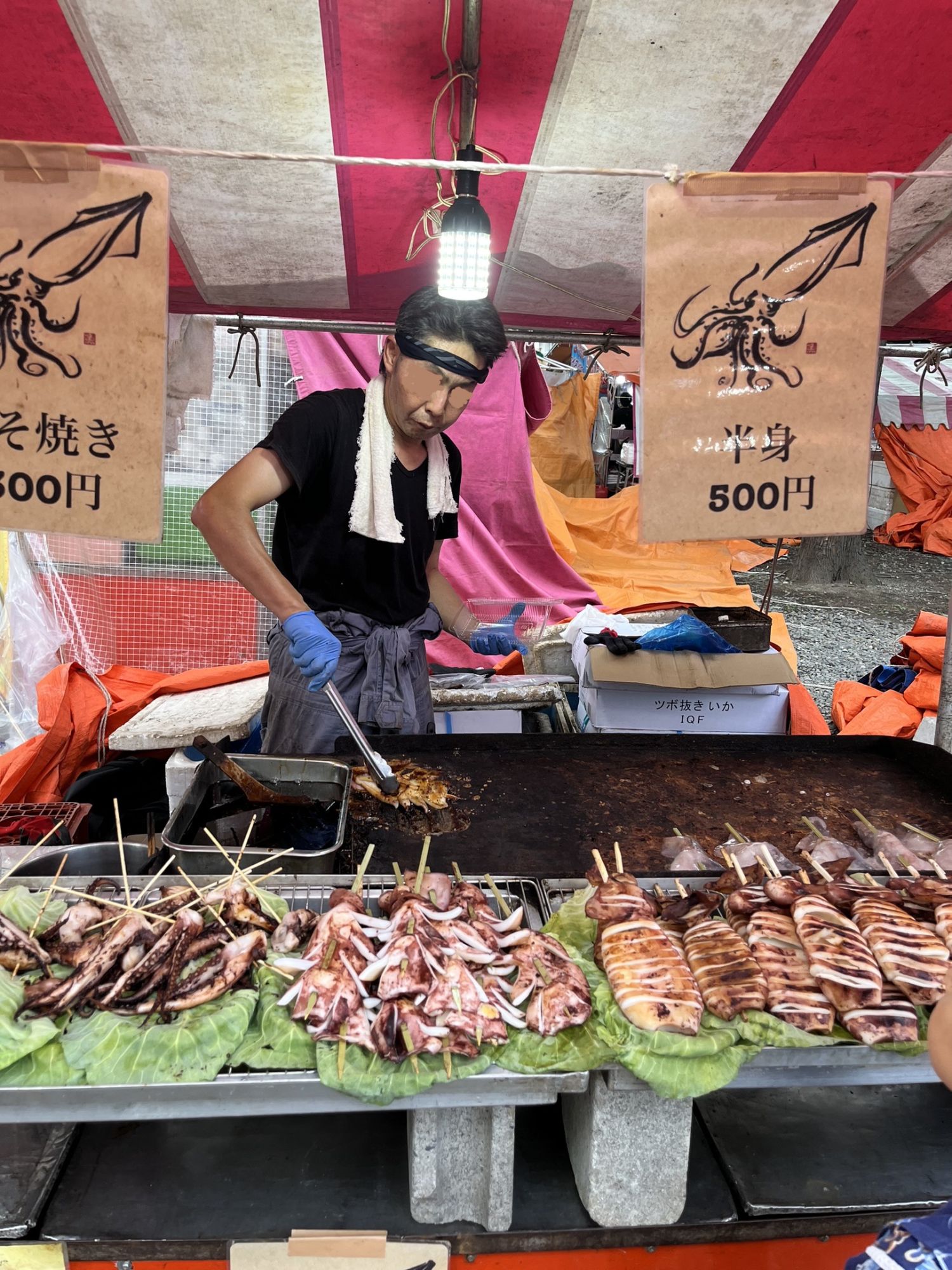Comme pour la plupart des matsuri, le sanctuaire accueille de nombreux stand de nourriture festive. On y retrouve les traditionnels takoyaki (boulettes de poulpe), karaage (poulet frit), yakisoba (nouilles frites) ou meme des brochette de calamars grillés. Pour le dessert, vous avez le choix entre bananes au chocolat, crêpes ou coupes de glace pilée, le fameux « kakigori ».