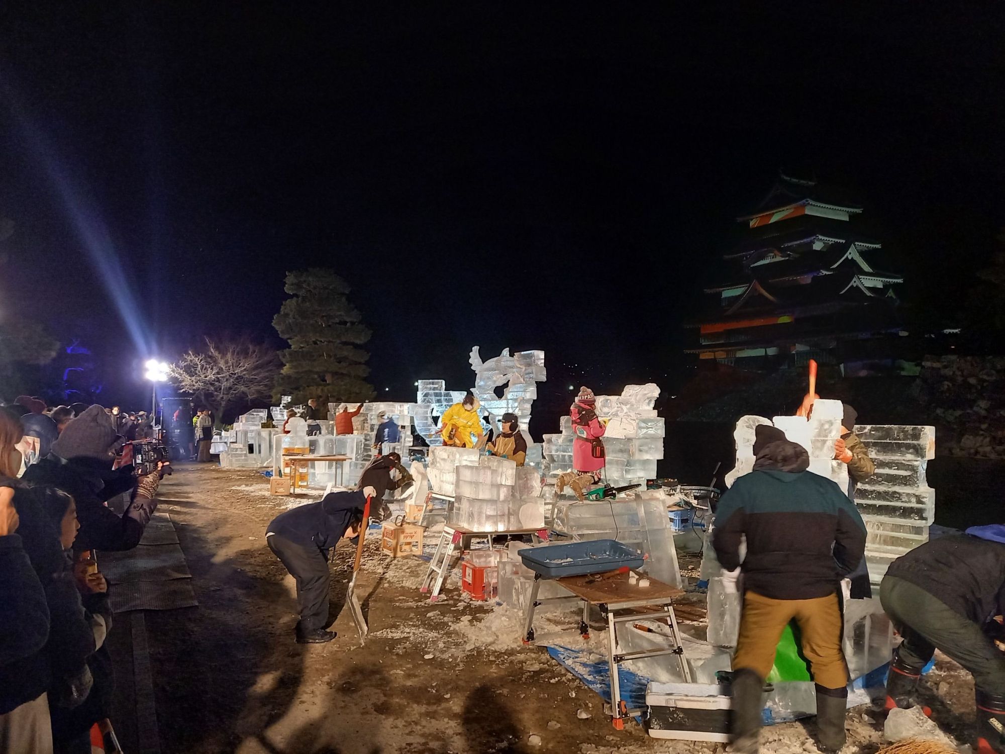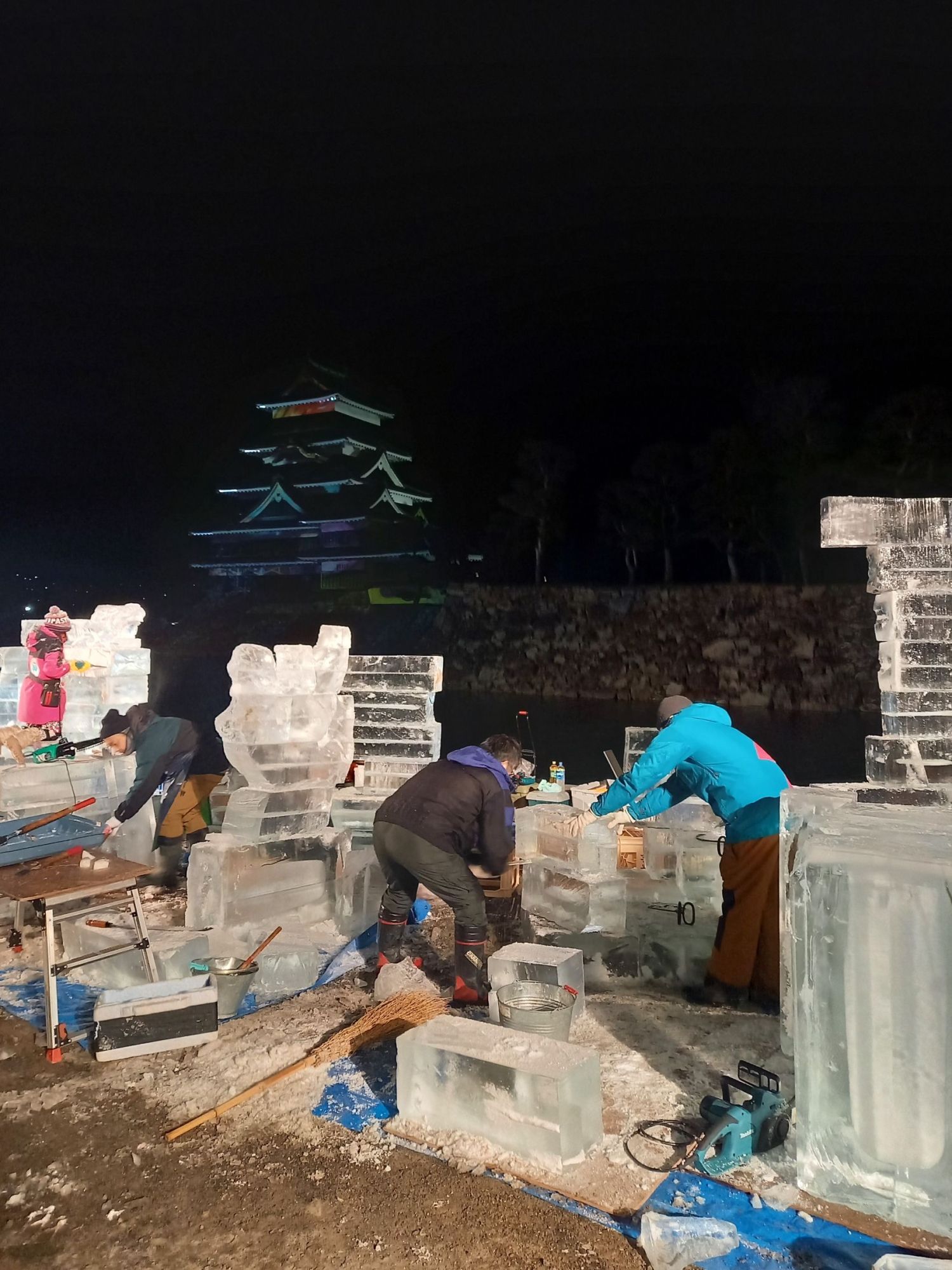 L’événement le plus attendu est évidement le grand concours de sculpture du château qui réunit des participants venus de tout le Japon. Dès l’après-midi du samedi, les équipes préparent leur materiel, et transportent leurs blocs de glace jusqu’à l’emplacement qui leur a été attribué.