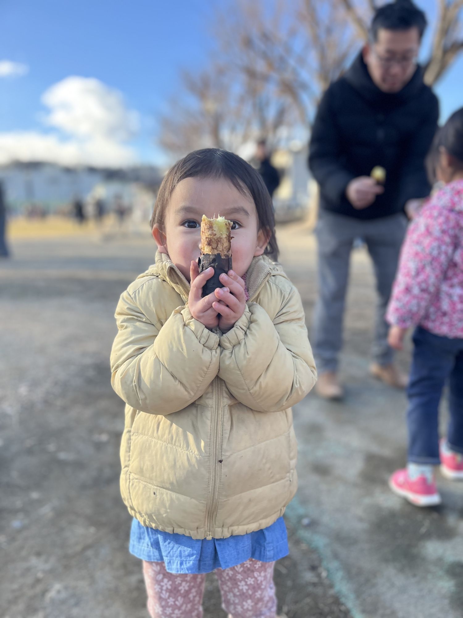 Une fois que le feu se calme, les enfants sortent leur « Mayu-dama » petite boules de mochi accrochées au bout de branches pour les faire griller au dessus des quelques flammes restantes. Certains groupes en profite aussi pour faire cuire des patates douces au milieu des braises afin de déguster de bons « yaki-imo »