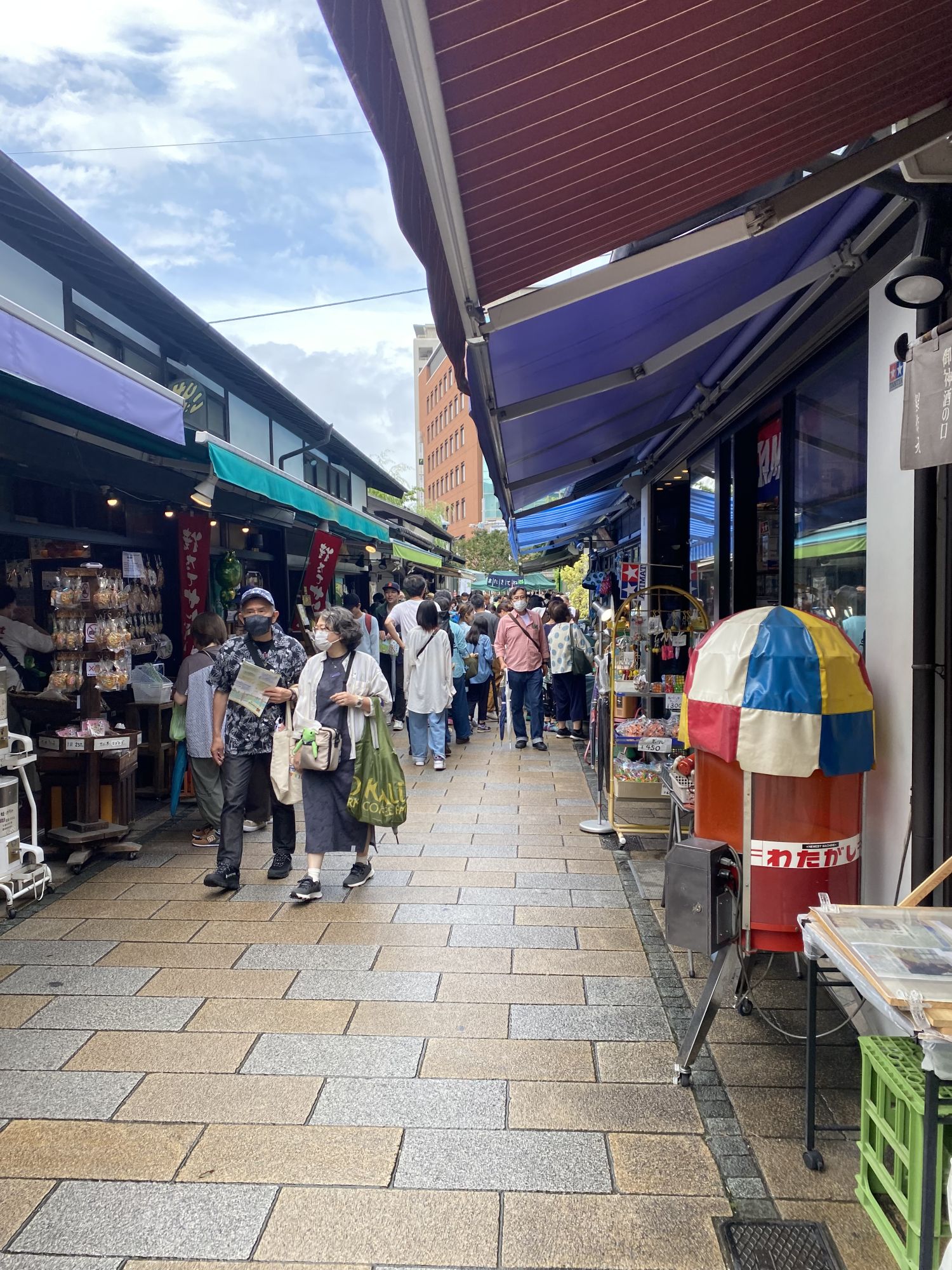 Mais pourquoi la grenouille ? Depuis l’ère Meiji, alors que la construction du sanctuaire Yohashira permet à la rue de ses commerçants de prospérer, il était dit de cette rue piétonne qu’elle était à la fois un lieu de commerce (Kaeru = acheter) et de sécurité (kaeru = rentrer chez soi). Par association, la grenouille qui se prononce également « kaeru » en japonais est devenue la mascotte de la rue.