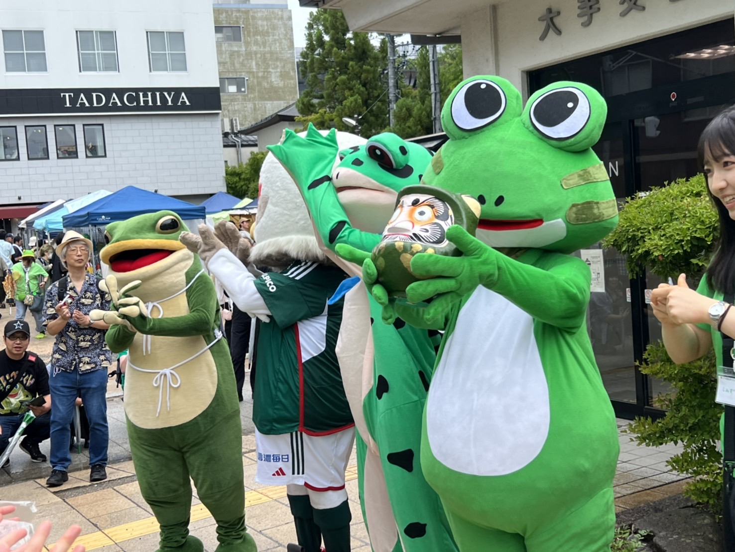 Pour animer la journée, des mascottes de grenouilles se baladent dans la ruelle et prennent des photos avec les visiteurs. Il y a également des live de musique et des jeux organisés sur scène.