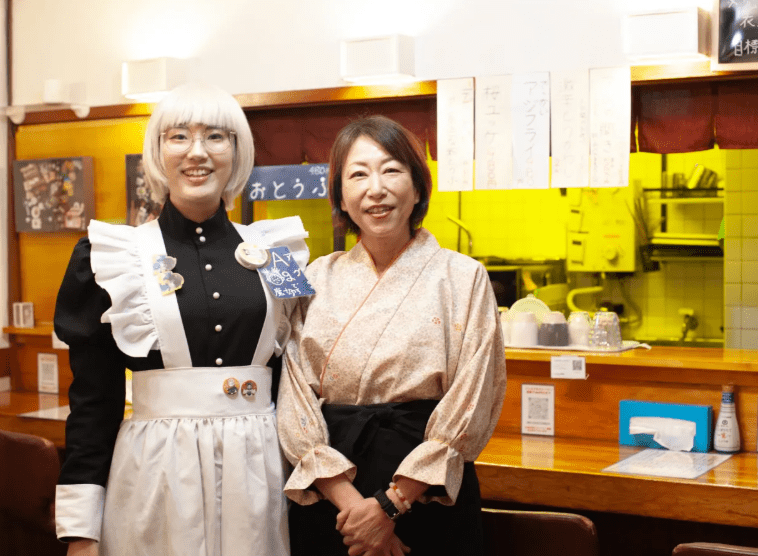素朴で温かみのある雰囲気の中で、家庭的な定食と信州地酒をゆっくり味わえる一軒です。定食ランチのほか、地酒で昼飲みを楽しむ方も多く、メイド姿のおかみさんやスタッフの丁寧な接客が訪れる人の心を和ませます。
