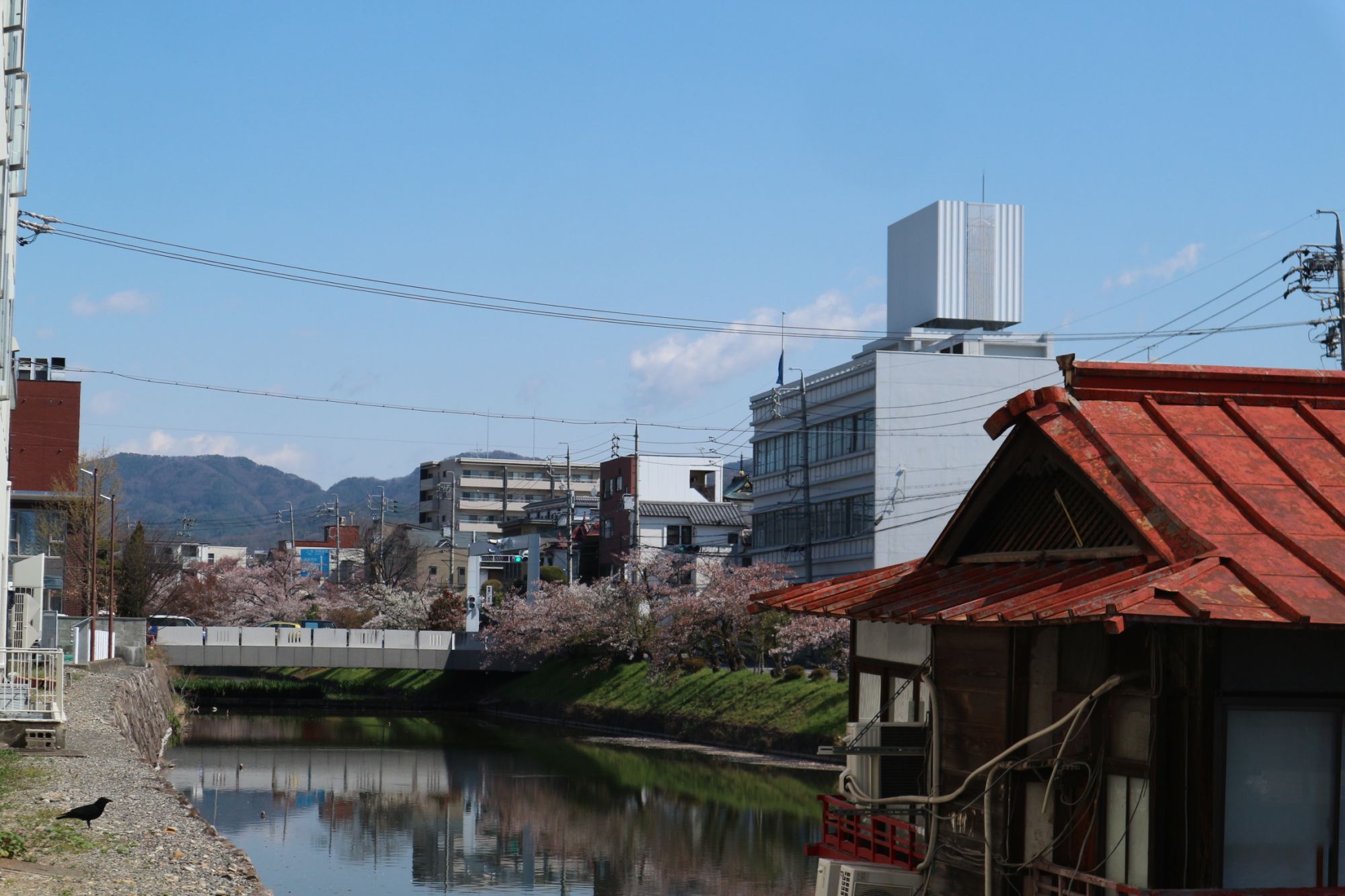 毎年桜の花が咲く時期には、この場所は撮影スポットになり、堀沿いの桜並木と西に見える北アルプスがとても美しいです。