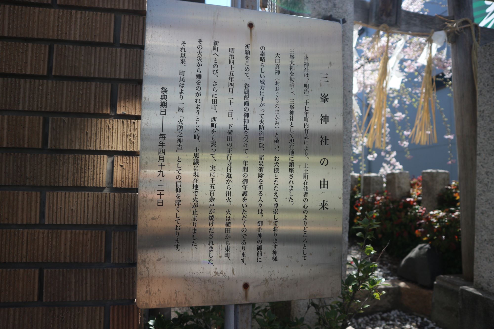 備えられた案内看板を読むと明治37年に町内の有志により上土在住者の心の拠り所として三峯大神を勧請し、三峯神社として現在地に鎮座されました。