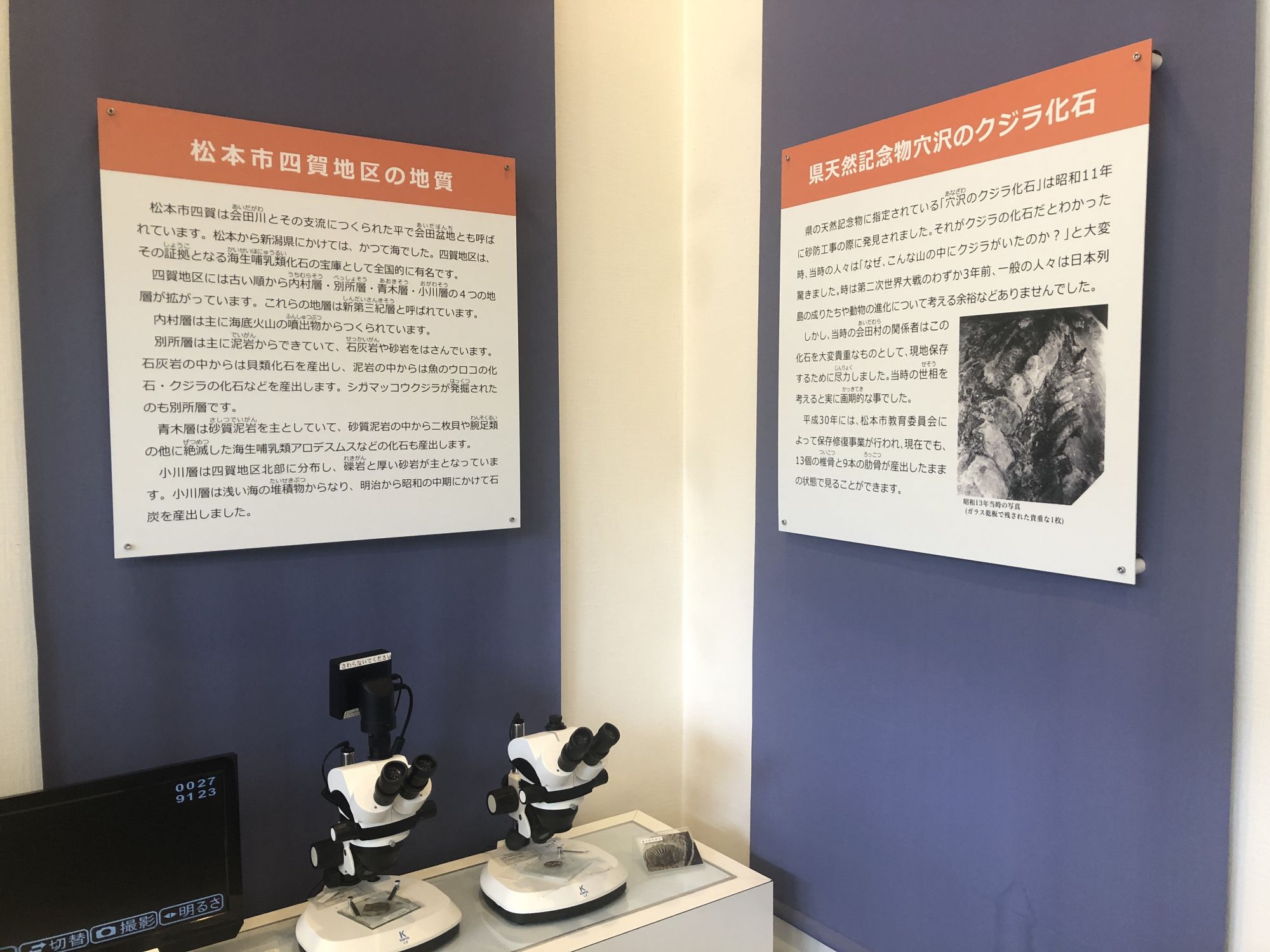 松本市の北部に位置する四賀地区は、新生代新第三紀の別所層や青木層などの化石を多く含む地層が分布し、県内でも有数の海生哺乳類化石(クジラ類、鰭脚類)の宝庫として知られています。