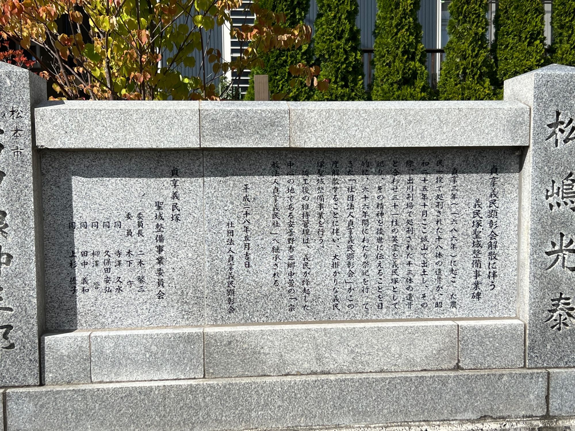 平成28年(2016)、公益法人制度の見直しによって、義民塚を築いた際に発足した貞享義民顕彰会が解散するにあたり、株式会社サンエネックにより大規模な義民塚聖域整備事業を実施しました。整備にあたった関係者によって「義民塚を守る会」を設立し、義民塚及びその周辺の環境維持活動を実施しています。また、義民塚の清掃を丸の内中学校PTAと連携して行っています。