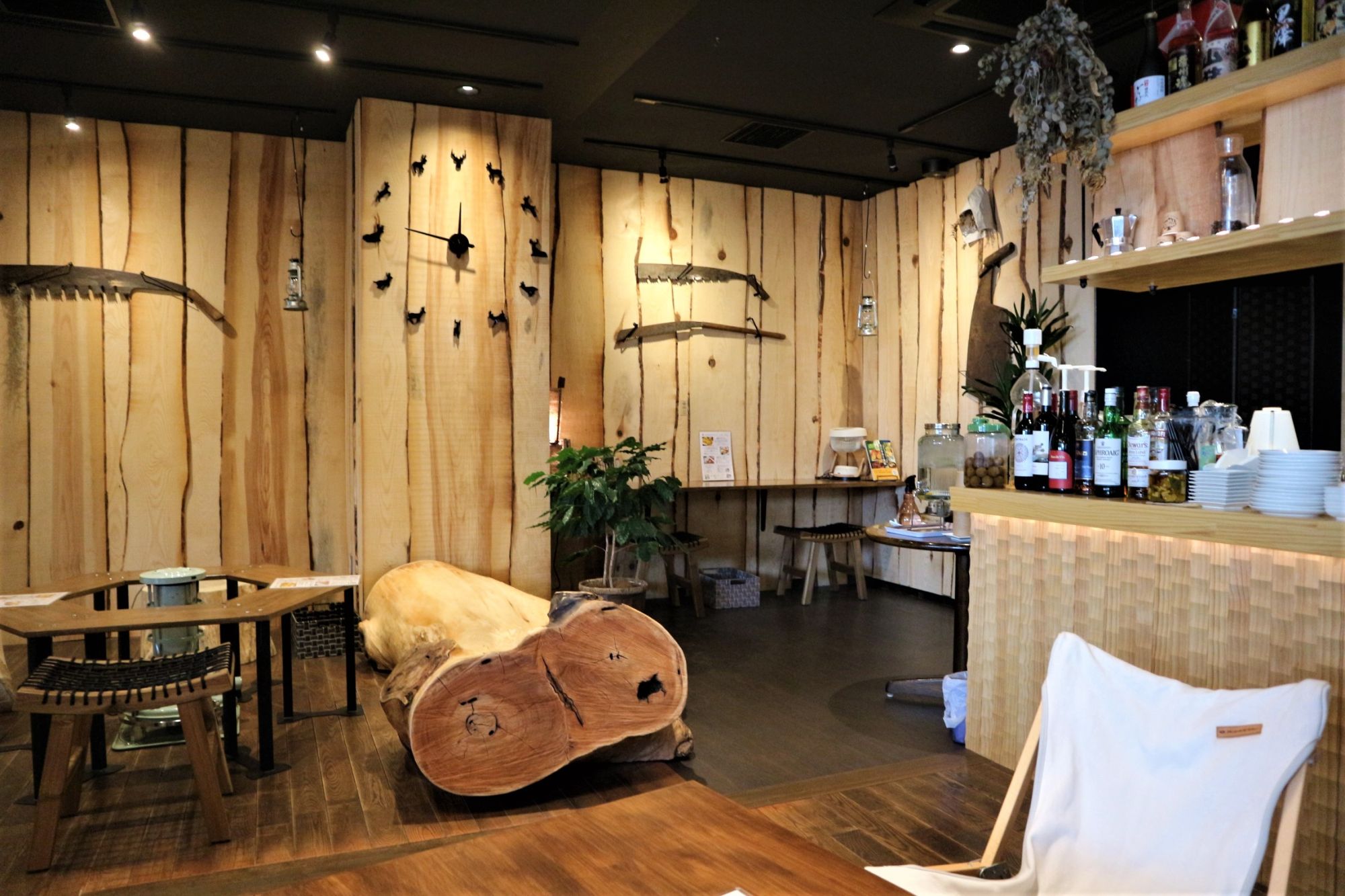 店内は、アウトドアの雰囲気 木のベンチ、木の壁には、カモシカの壁掛け時計・斬新なノコギリのオブジェ