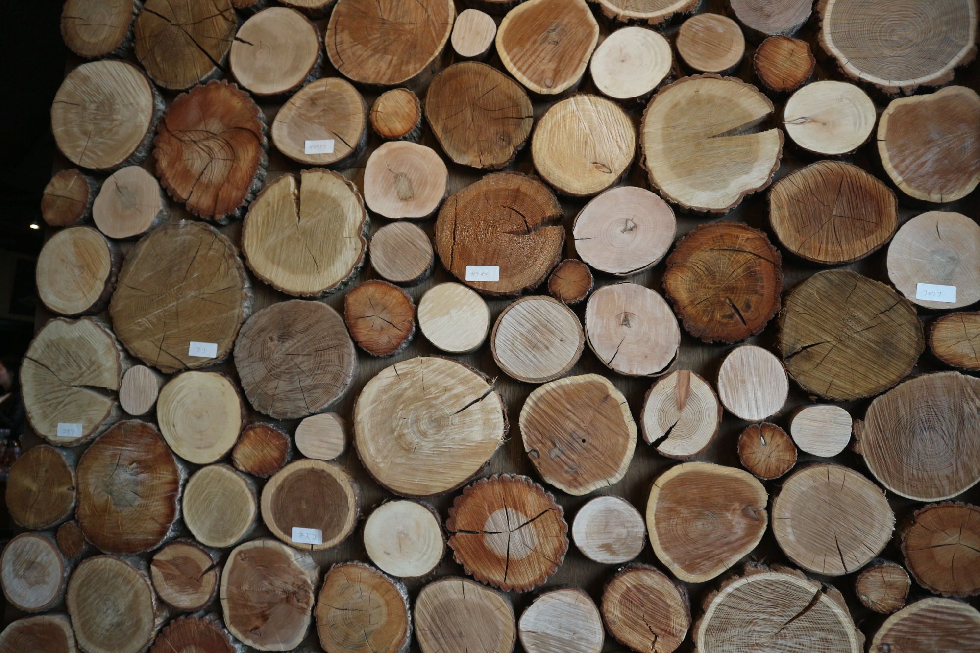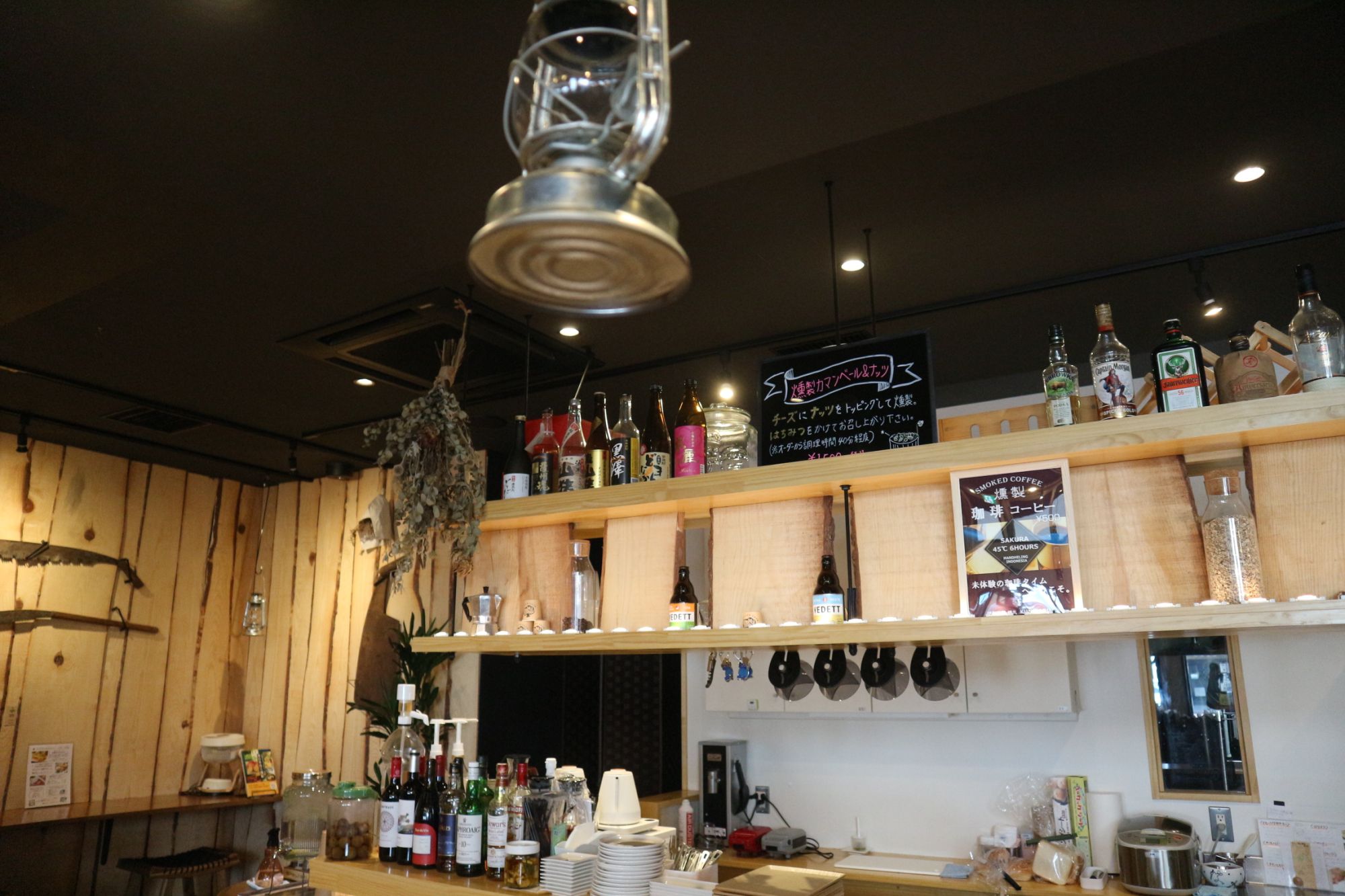 店内は、アウトドアの雰囲気 木のベンチ、木の壁には、カモシカの壁掛け時計・斬新なノコギリのオブジェ