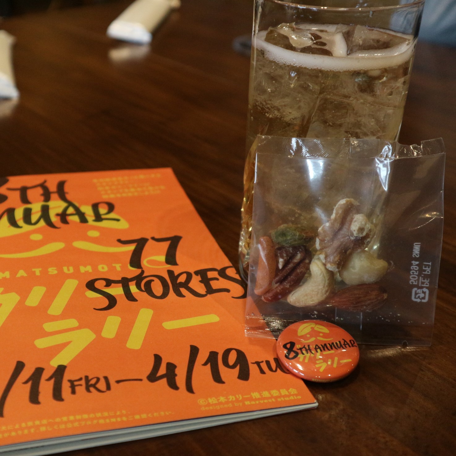 3軒カリーラリー参加店を周ると、オリジナル缶バッジがもらえます。4軒目以降のサービスは、燻製ナッツです。