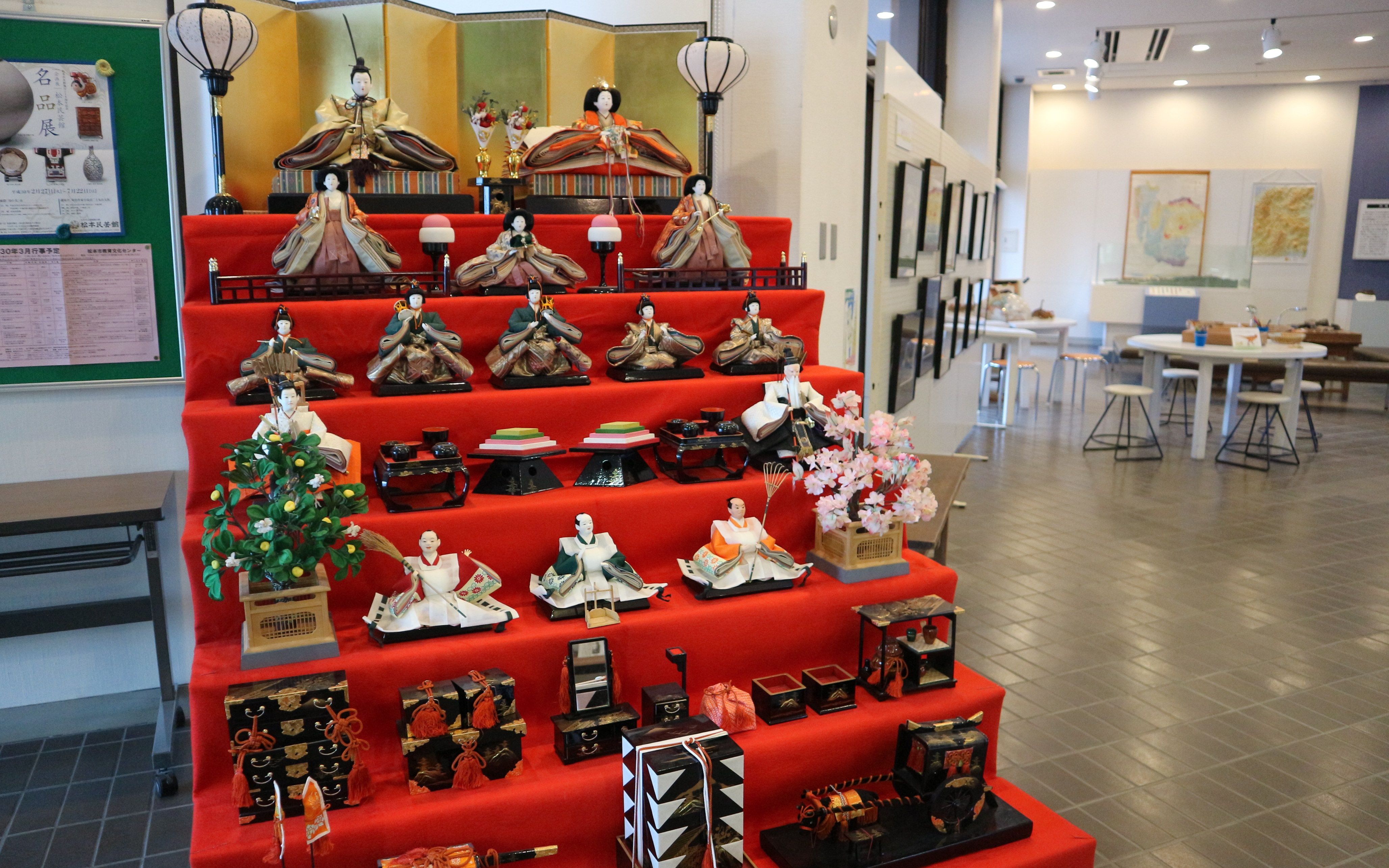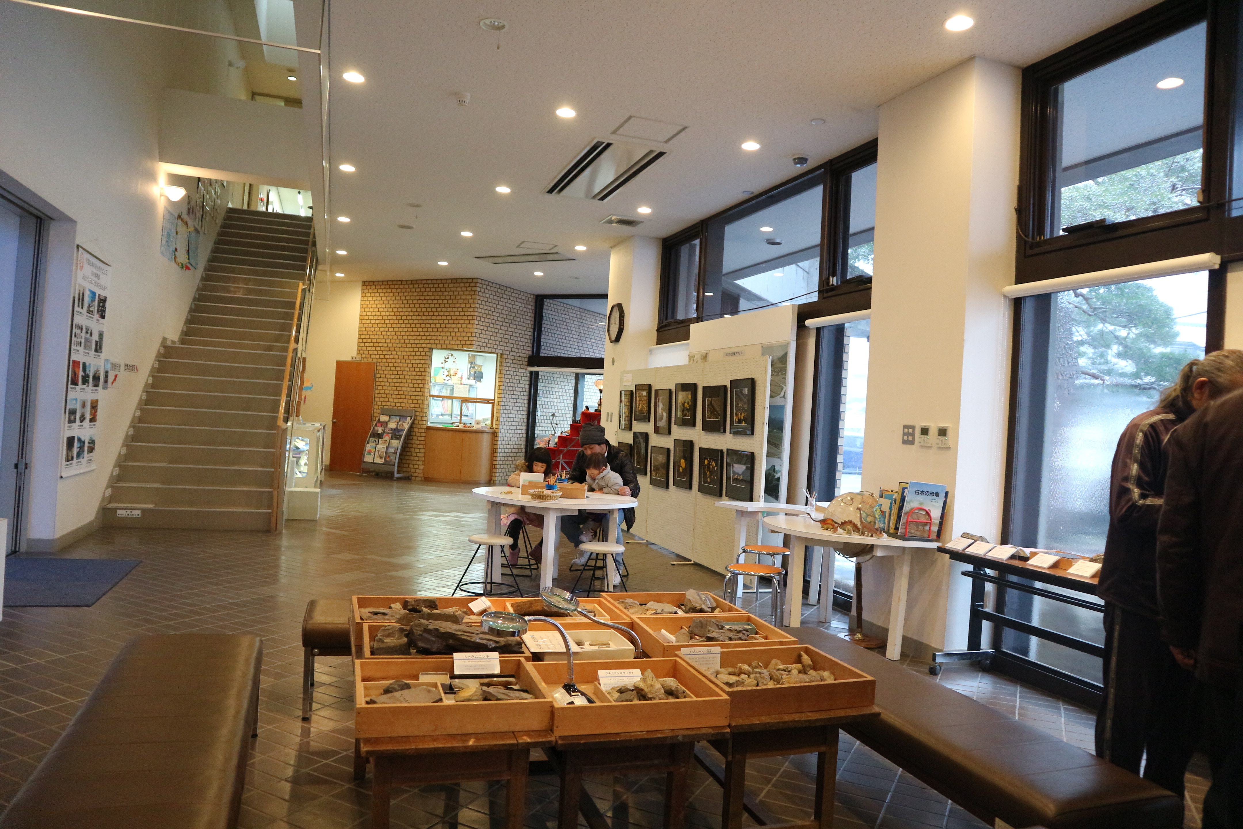 1階ロビーには、直に触れる化石コーナー・化石教室で採出された化石、ぬり絵コーナー、入り口付近にはこの地域の月遅れのお雛様も飾られて来場者をお迎えしていました。