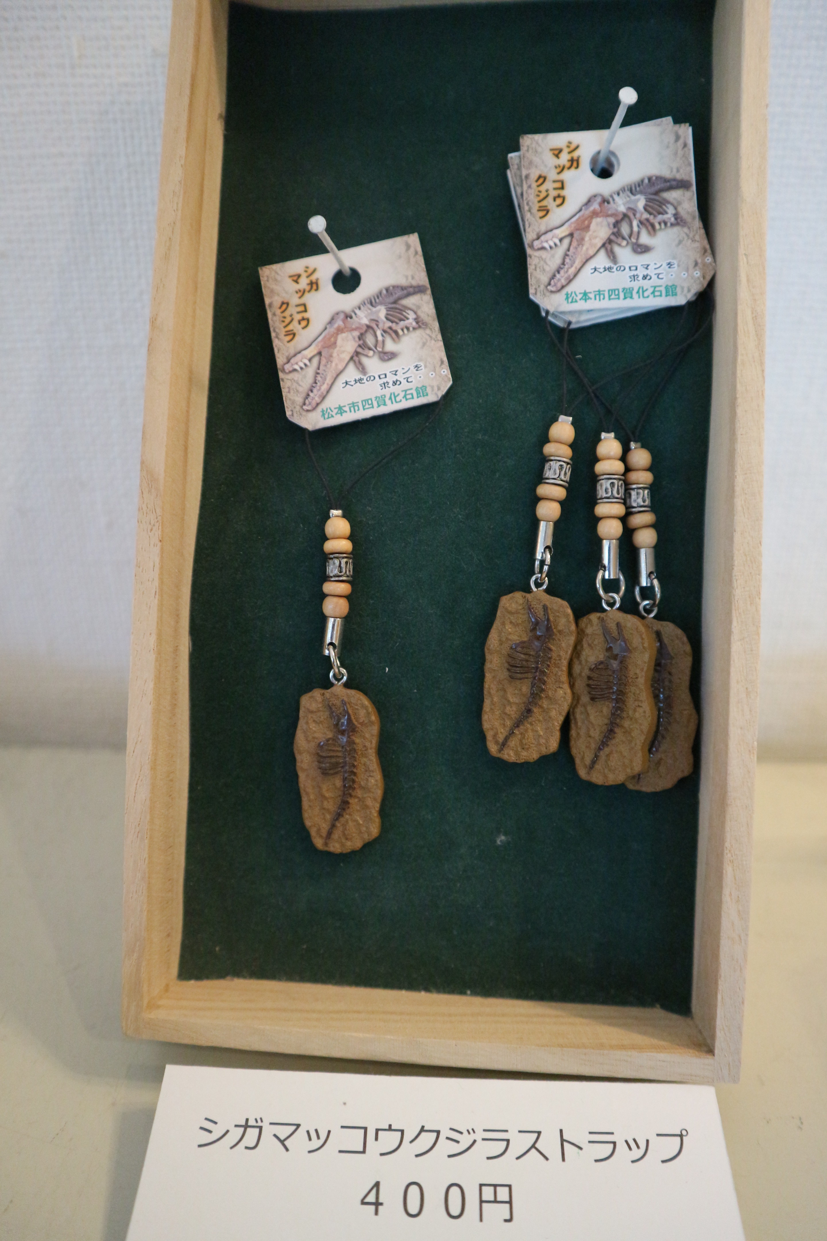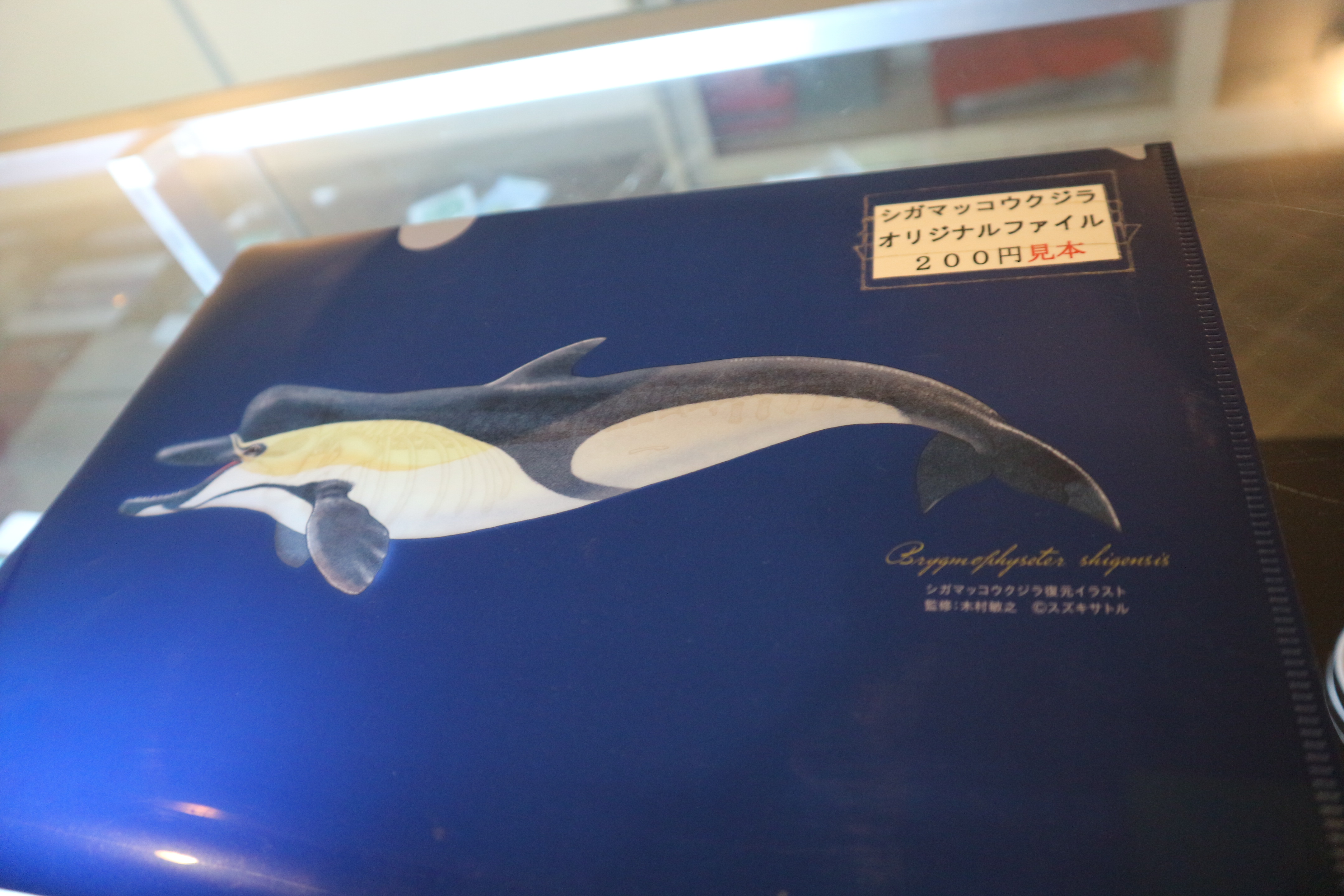 お勧めは、四賀化石館のシンボル、シガマッコウクジラの全身骨格をポストカード(100円)・クリアファイル(200円)オリジナル商品です。絵本「きょうりゅう」の作者スズキサトルさんデザインです。