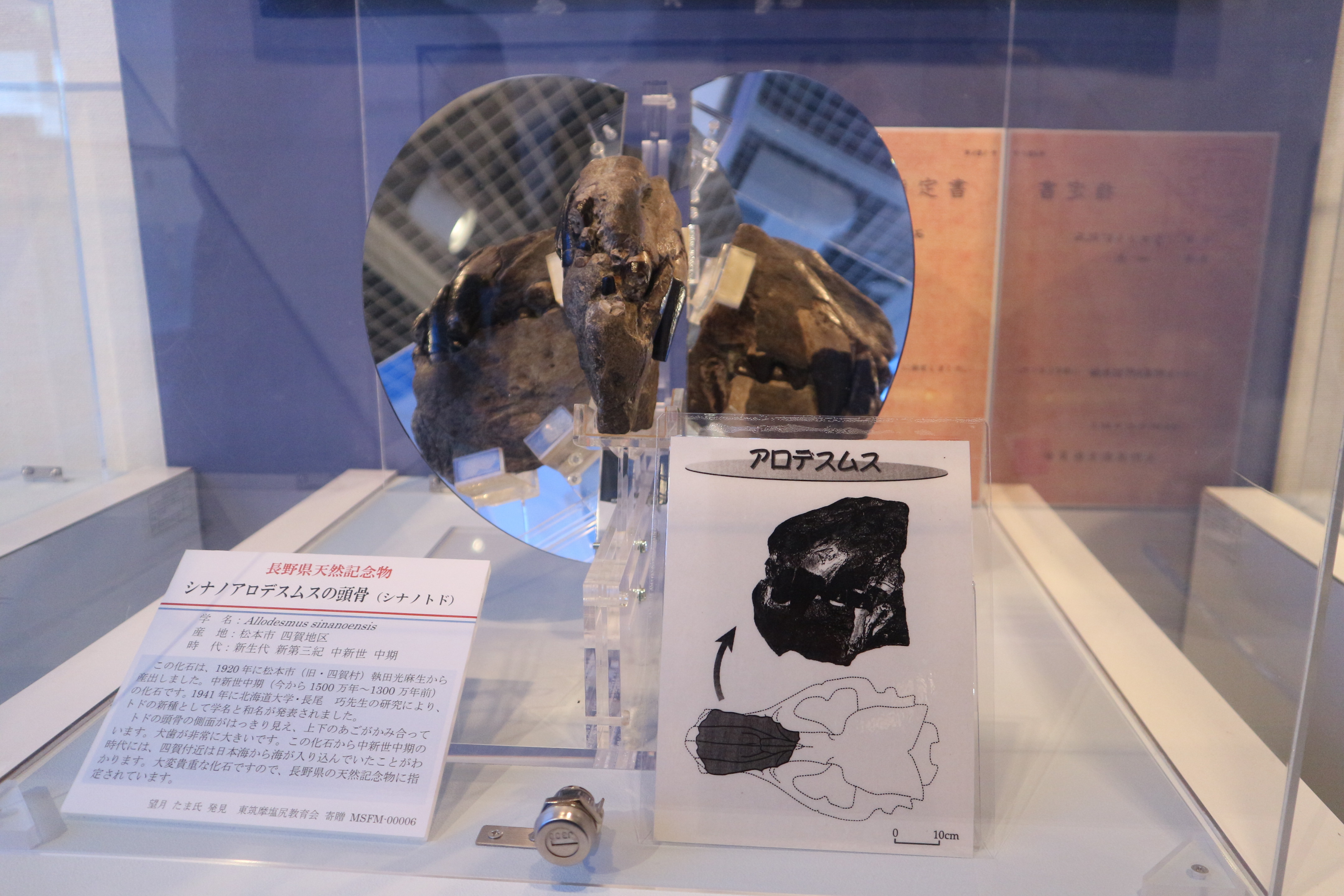 このアロデスムス化石の頭骨が日本で最初にみつかったのが四賀地区でした。1920年(大正9年)、発見当初は何の化石か全くわからず、後にトドの新種としてシナノトドという和名がつきました。しかし、現在ではシナノアロデスムスという学名がついています。