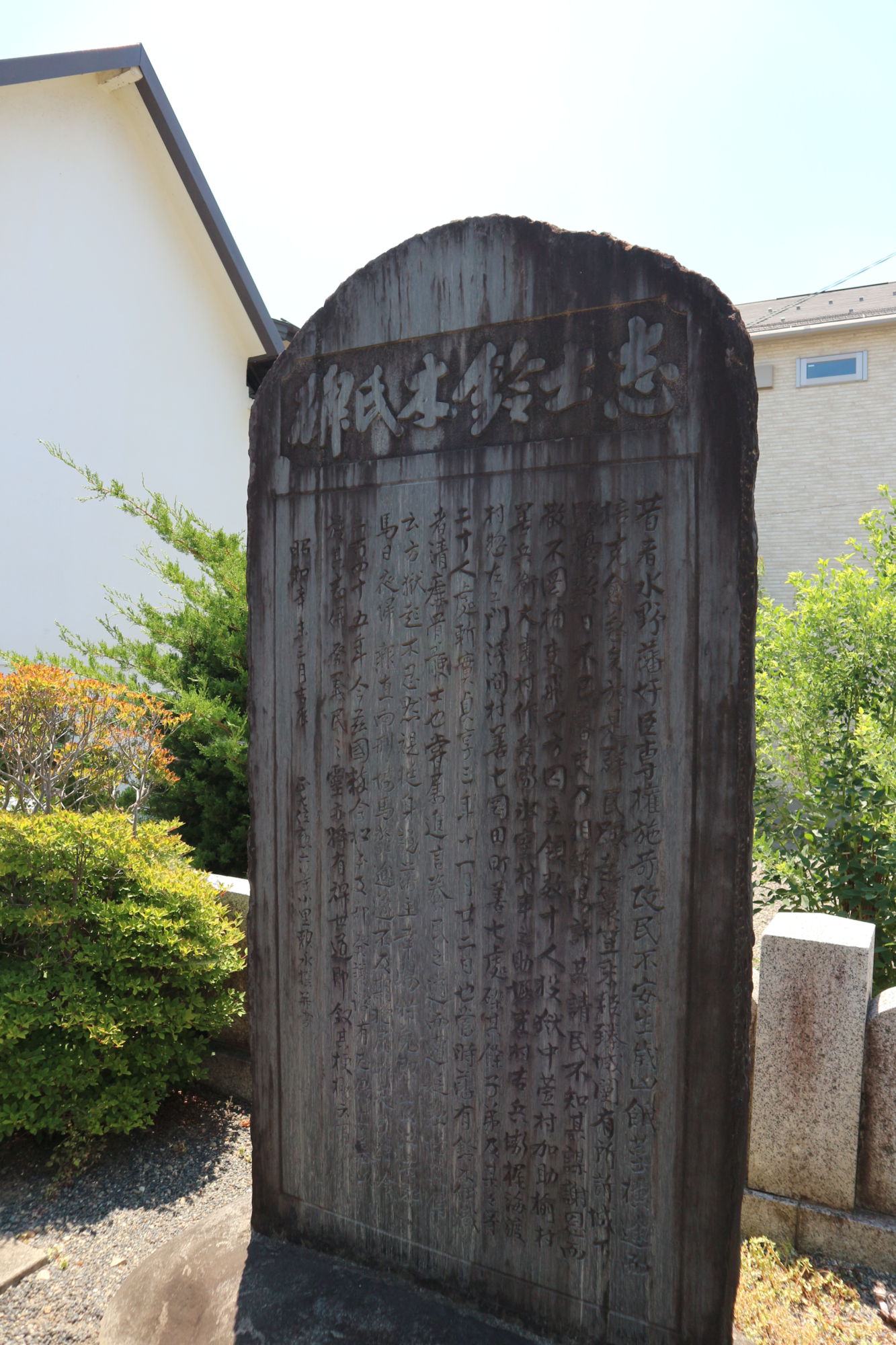 井戸の横に大きな石碑が2つ立っています。向かって左側の碑は鈴木伊織の墓と伝えるものです。