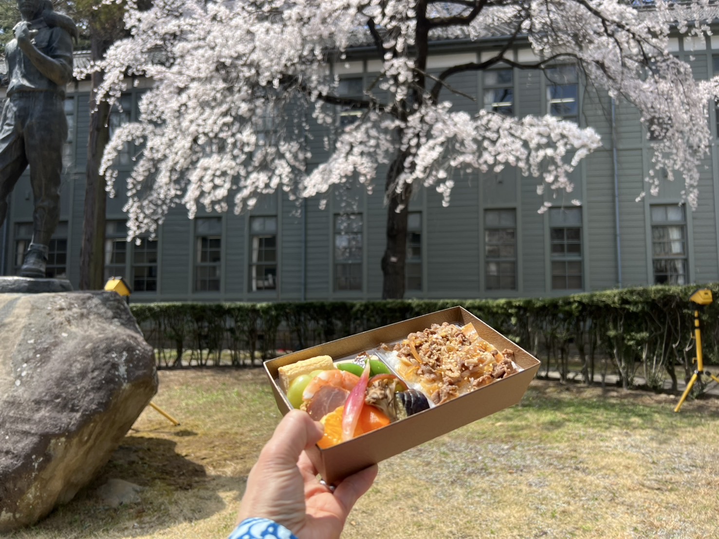 あちこちでベンチや芝生に座りお弁当を食べている人たちがいました。