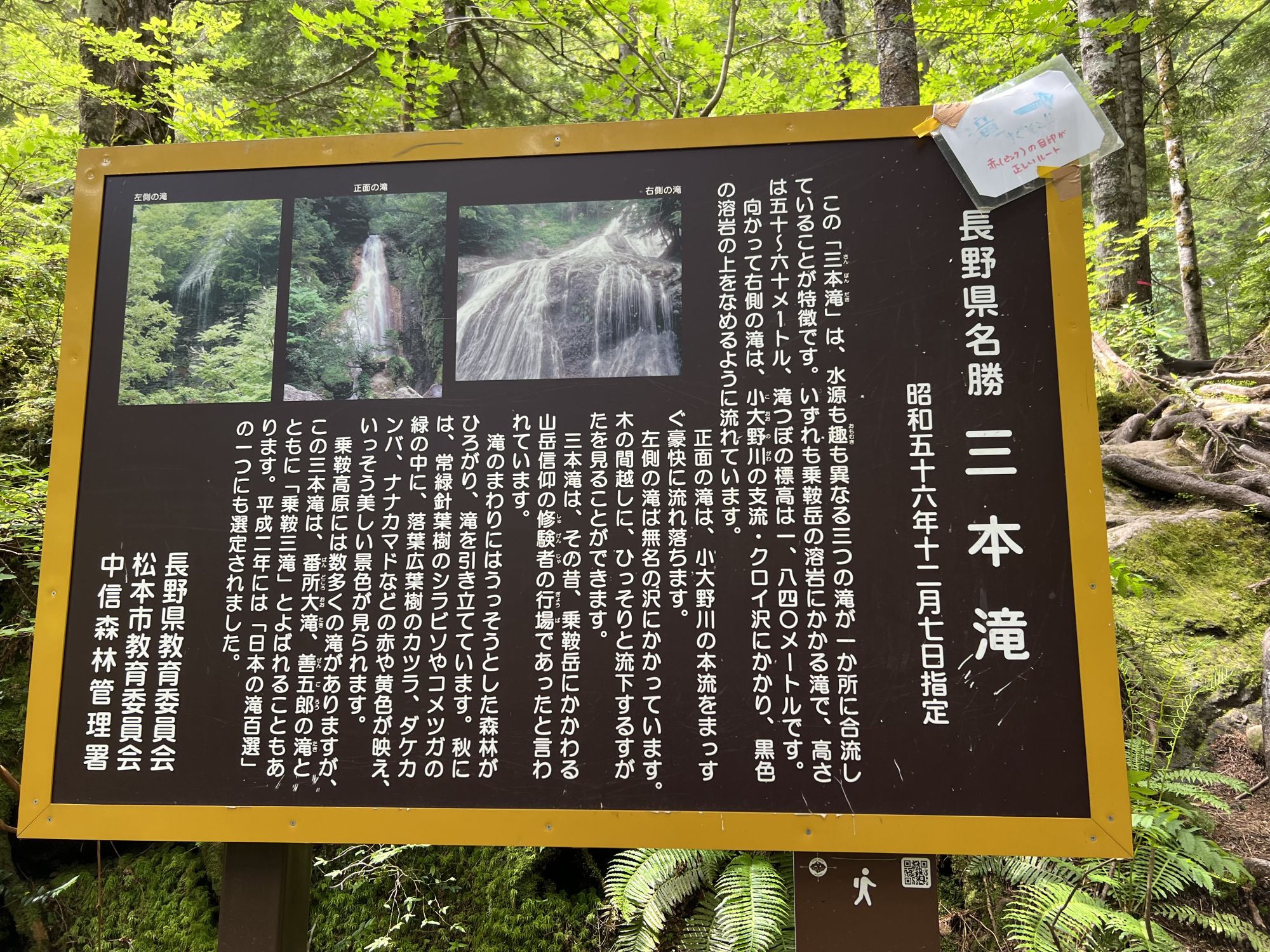 三本滝説明看板 「水源も趣も異なる三の滝が一か所に合流していることが特徴です。・・」