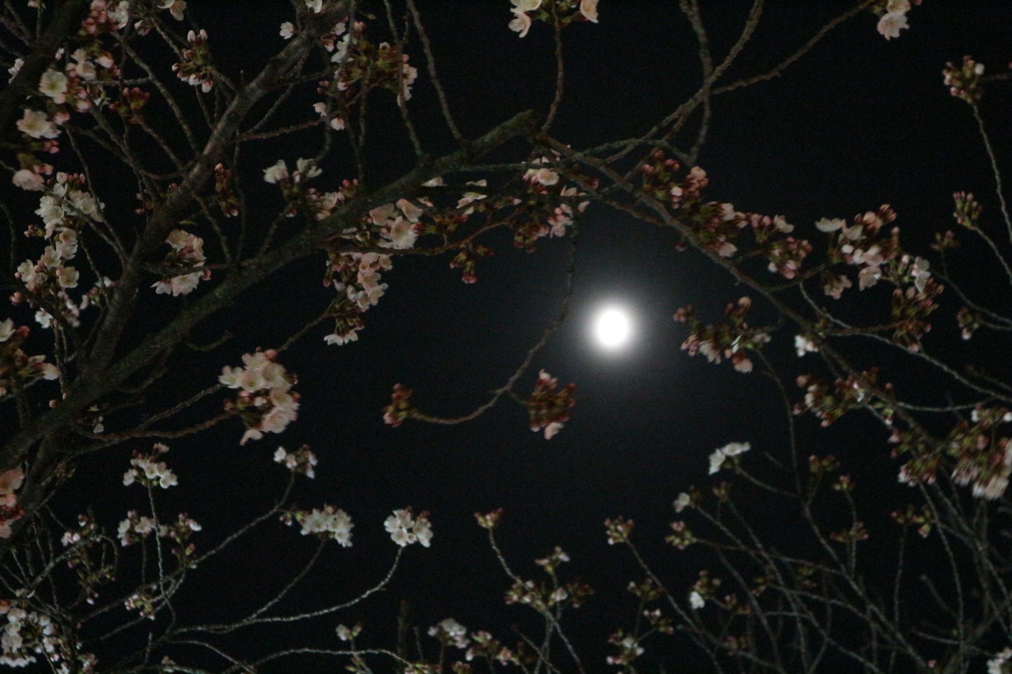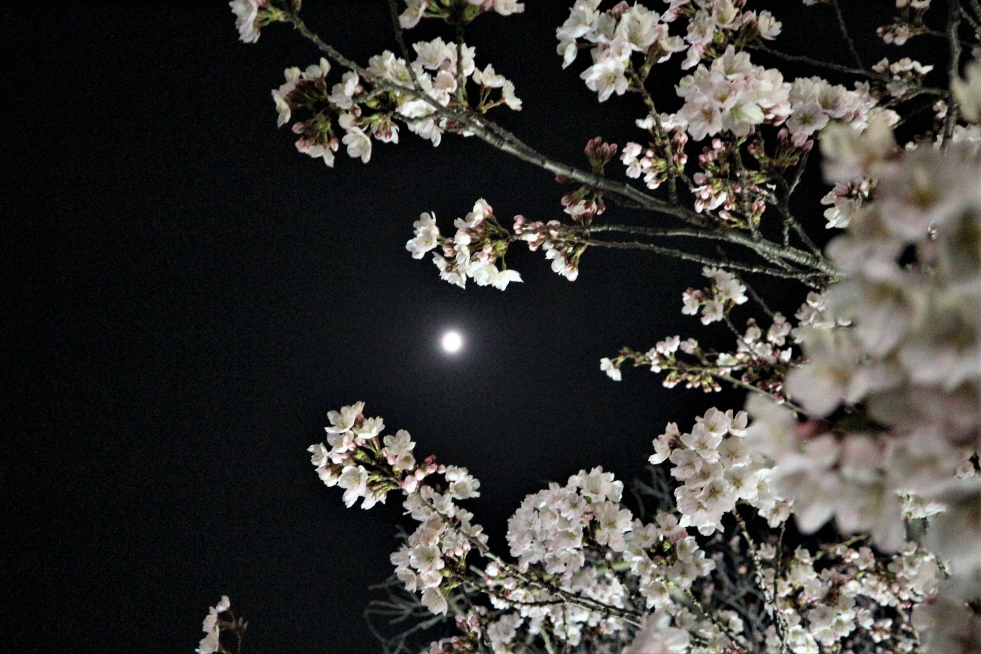 半分の月が花のあいだから見えます。