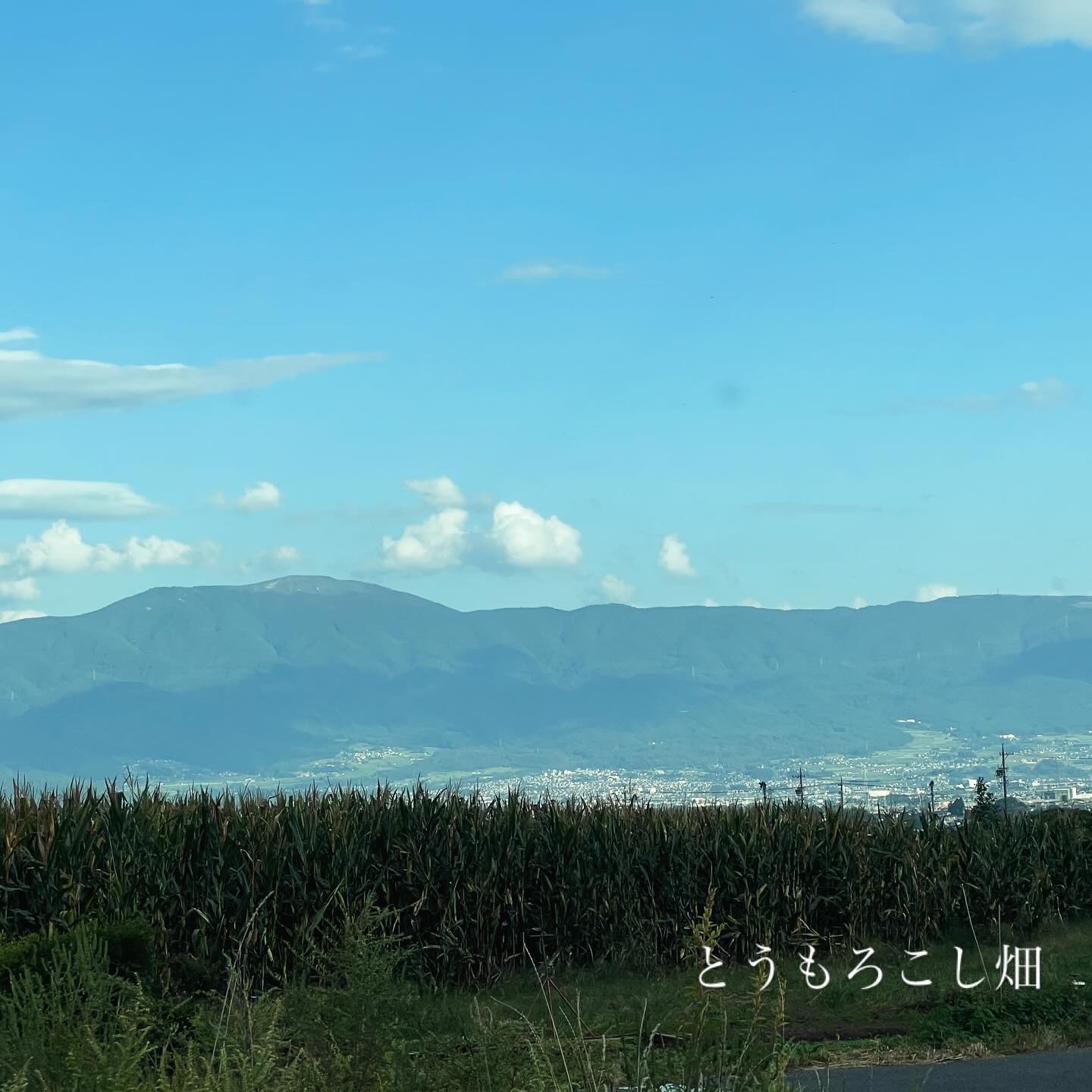 トウモロコシは、飼料用でしょうか?畑の向こうに松本平が見えます。