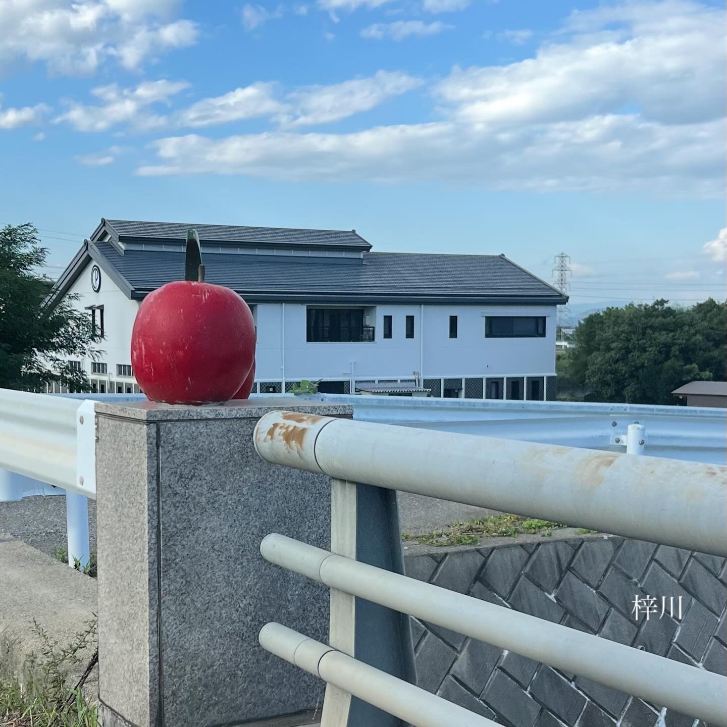 欄干に旧梓川村と旧波田町の名産のオブジェが乗っています。現在は2つの町と村は松本市になっています。