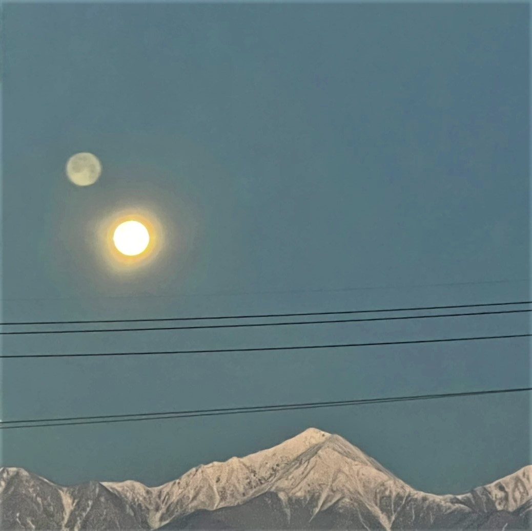 2月6日(月)朝6時40分から47分までの満月の様子です。2つ見えるのは、光に反応して月が2つに見えます。