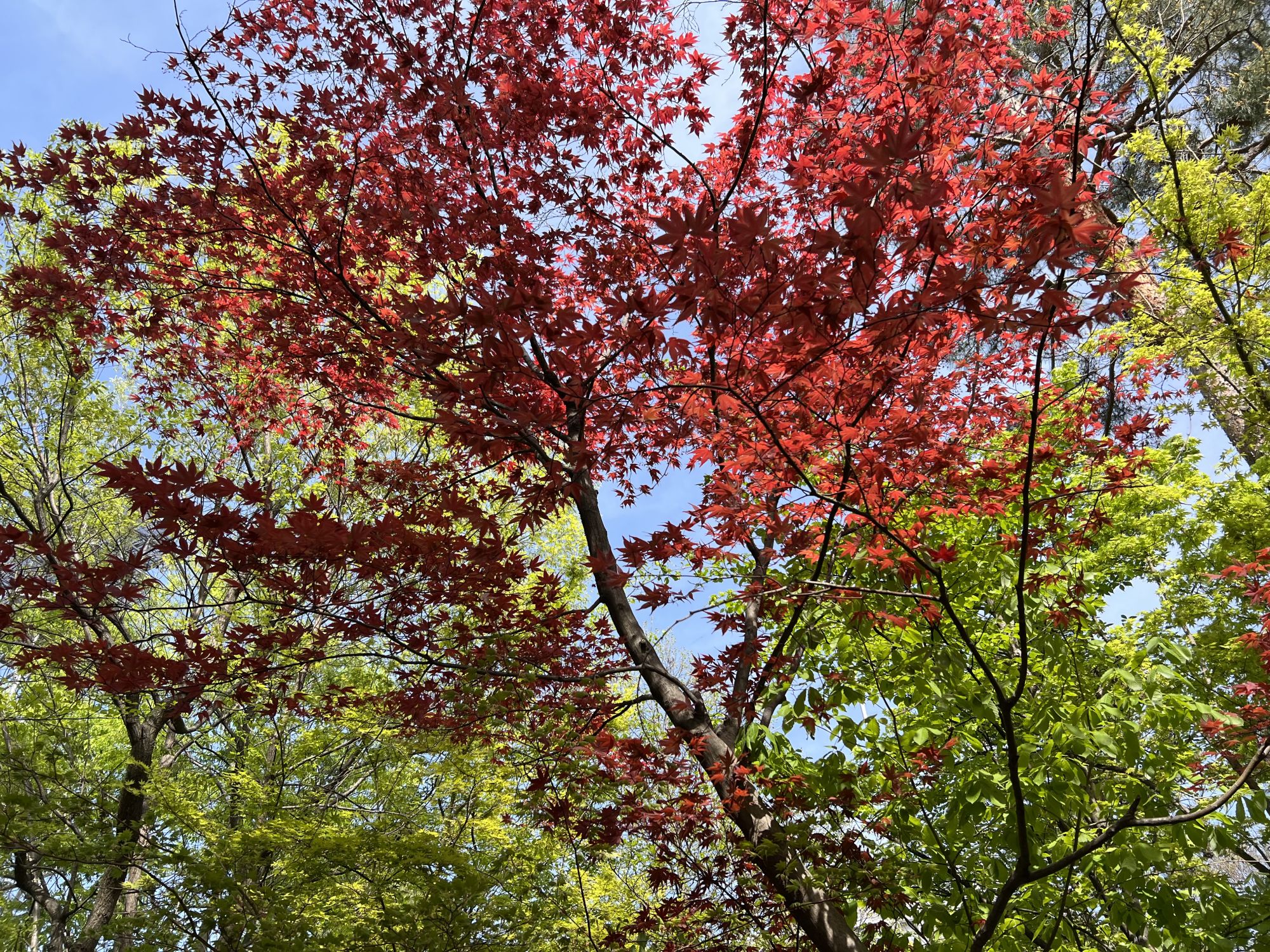 4月21日 晴れ 26.5℃ 四柱神社 紅葉の新緑が美しいです。1本だけ最初から紅い葉の品種です。