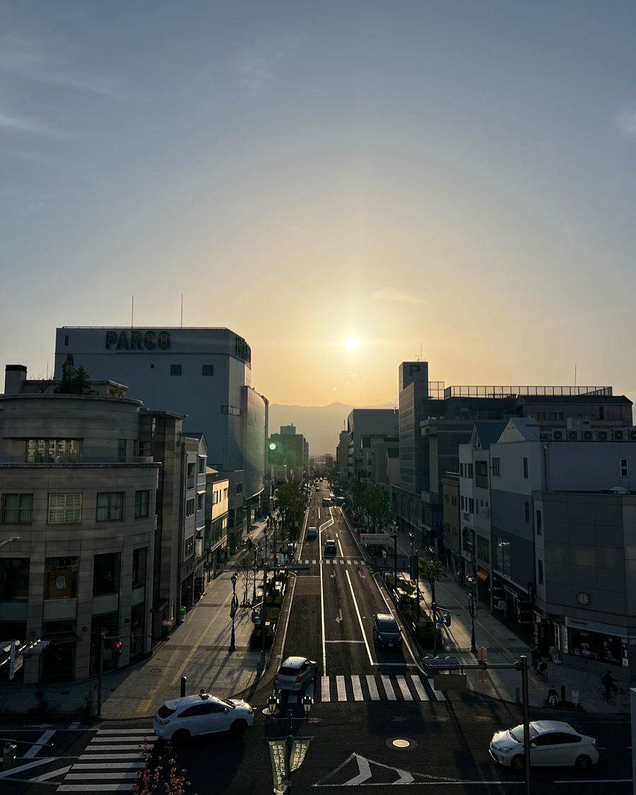 本町にある信毎メディアガーデン3階からビールを飲みながら陽が沈むのを待っていたところ、どんどん寒くなってしまい、陽が落ちるまで入られませんでした。