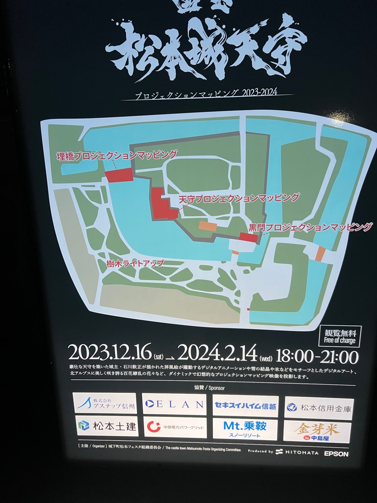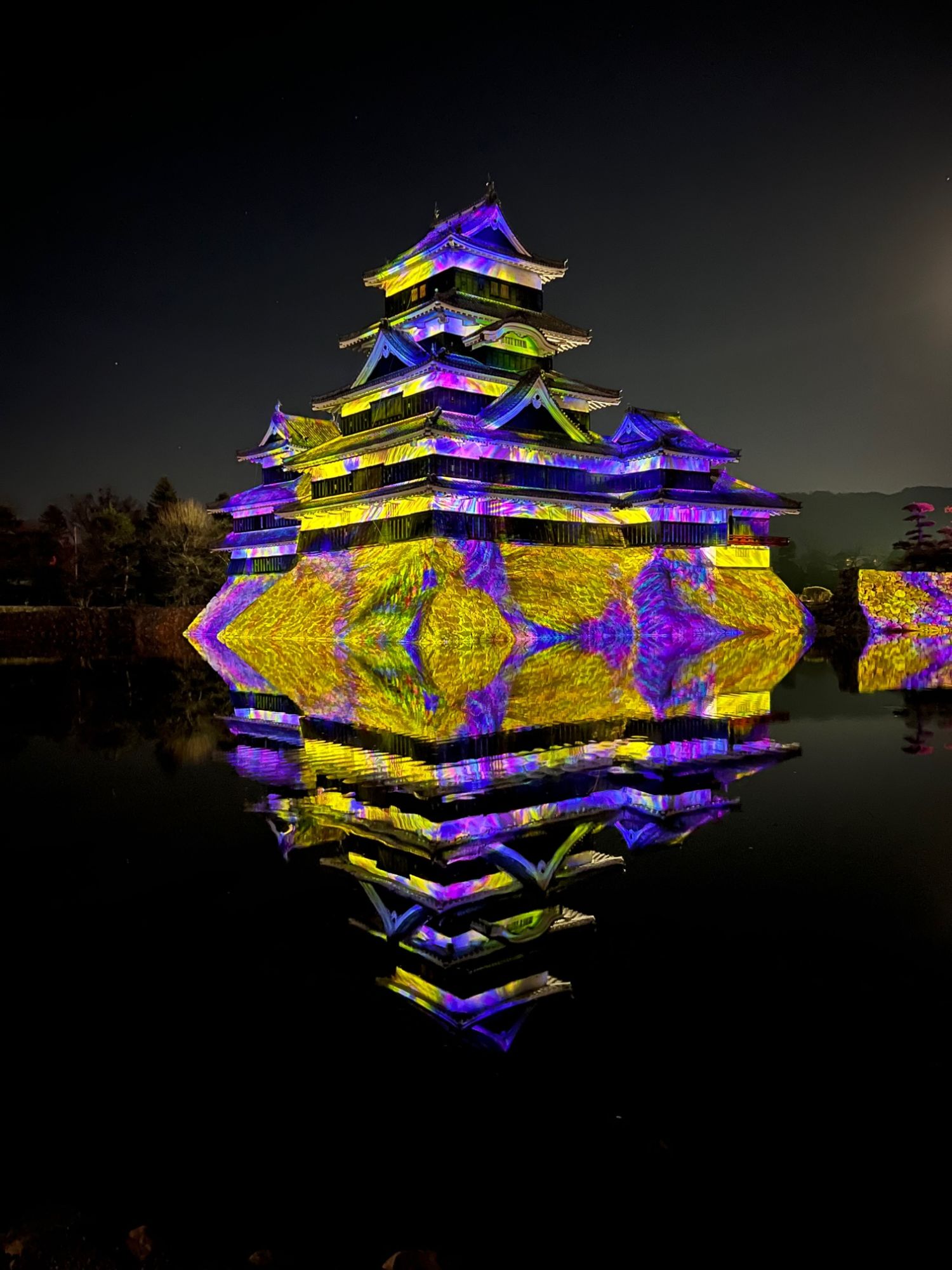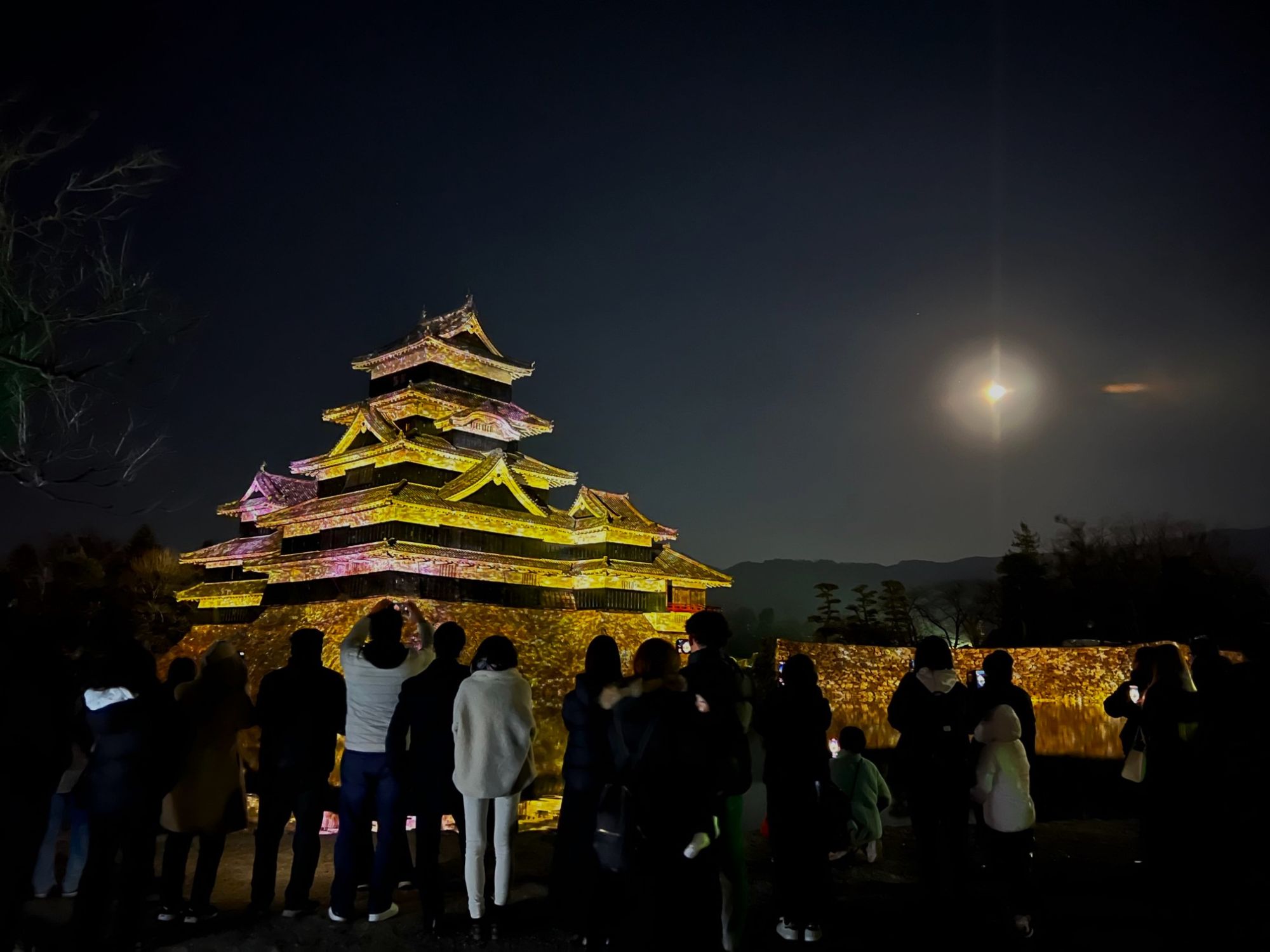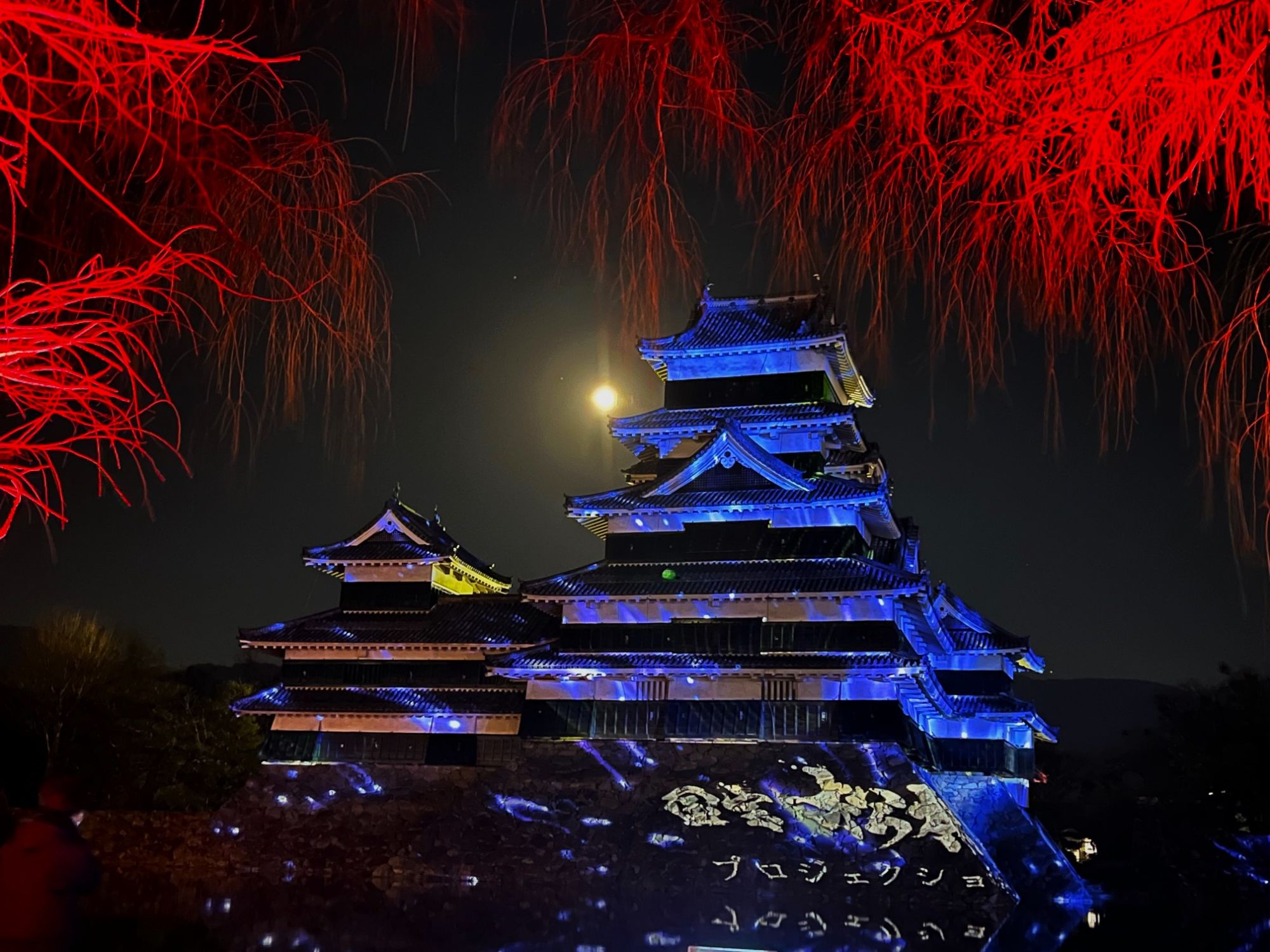 月と城とプロジェクションマッピング プロジェクションマッピング 国宝松本城 松本さんぽ 冬を楽しむ 2023.12.30 ♥25 12月28日 暖かい夜 朝も行きましたが、夜も松本城公園に寄りました。 月夜 月がとても綺麗な夜 月夜2 プロジェクションマッピング 掘りに映るお城と月 水鏡 天守 移動して見ると、月の位置が変わるのを楽しみました。 国宝松本城 プロジェクションマッピングスケジュールと地図 プロジェクションマッピングスケジュール 暖かい夜でしたが、やはり長時間いると冷えるので防寒対策は欠かせません。 Tweet