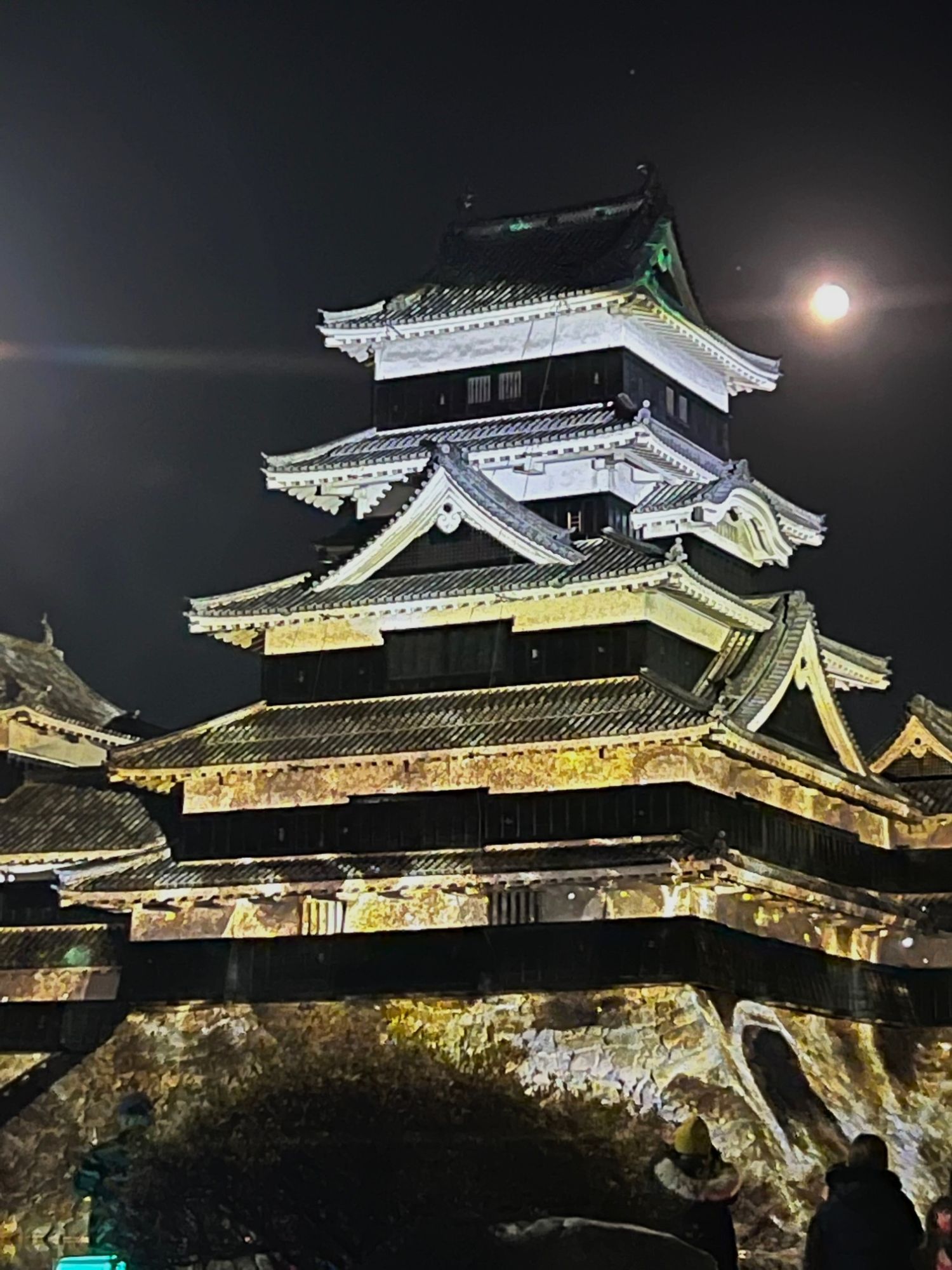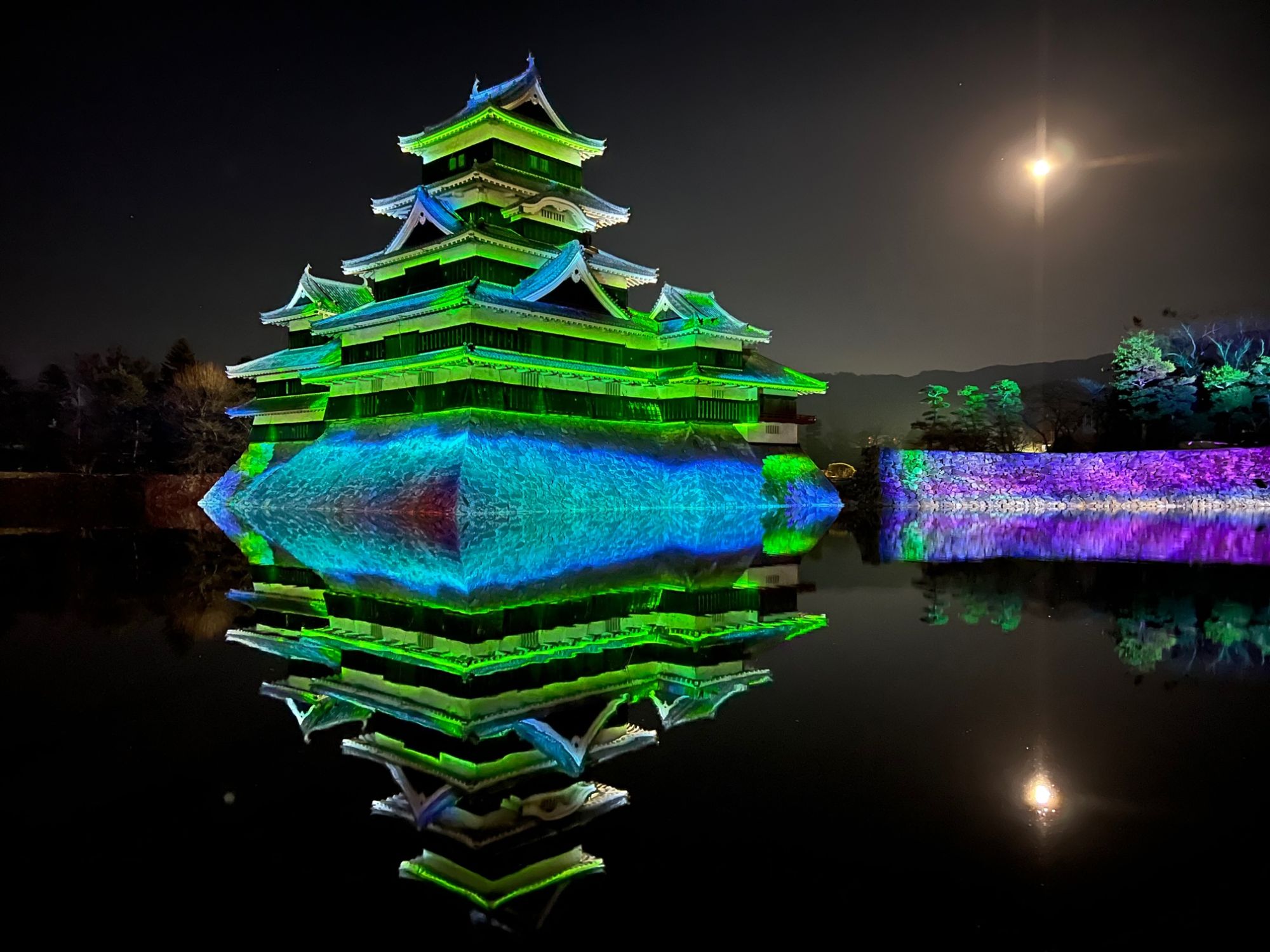 月と城とプロジェクションマッピング プロジェクションマッピング 国宝松本城 松本さんぽ 冬を楽しむ 2023.12.30 ♥26 12月28日 暖かい夜 朝も行きましたが、夜も松本城公園に寄りました。 月夜 月がとても綺麗な夜 月夜2 プロジェクションマッピング 掘りに映るお城と月 水鏡 天守 移動して見ると、月の位置が変わるのを楽しみました。 国宝松本城 プロジェクションマッピングスケジュールと地図 プロジェクションマッピングスケジュール 暖かい夜でしたが、やはり長時間いると冷えるので防寒対策は欠かせません。 Tweet