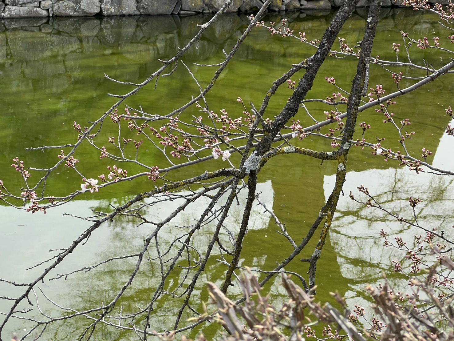 外堀から見た本丸庭園 コヒガンサクラが咲いています。