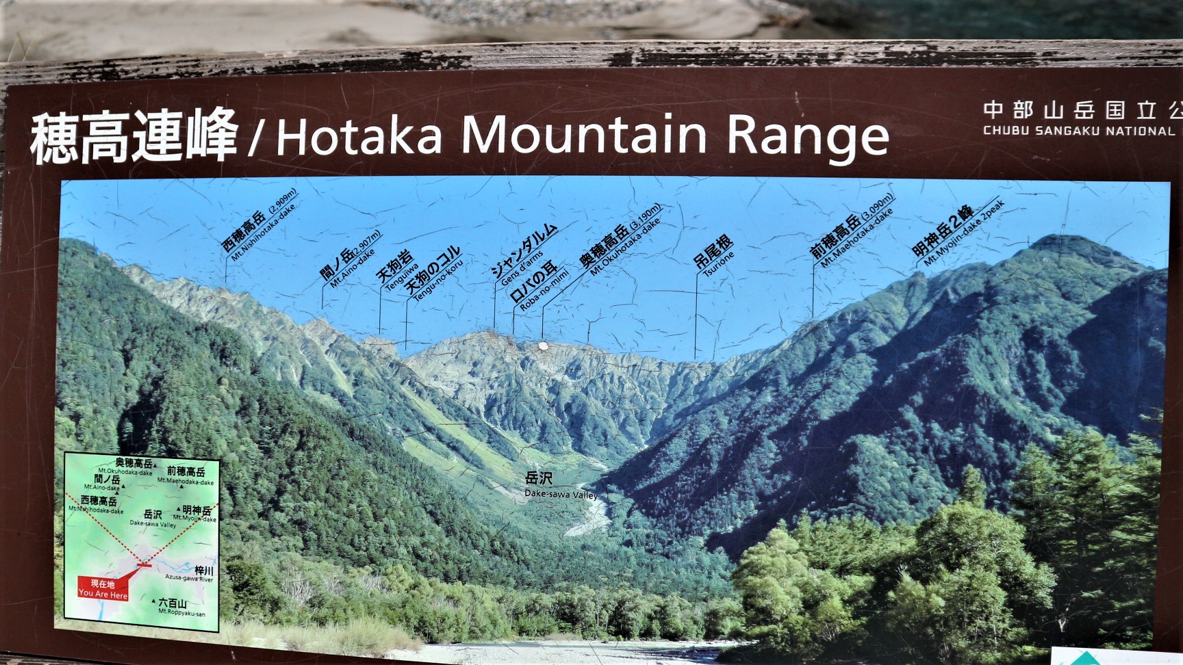 山の名前がわかる案内看板があります。ここに載っている場所で行ったことがあるのは、岳沢と西穂高岳です。載ってないけど北穂高岳にも登りました。