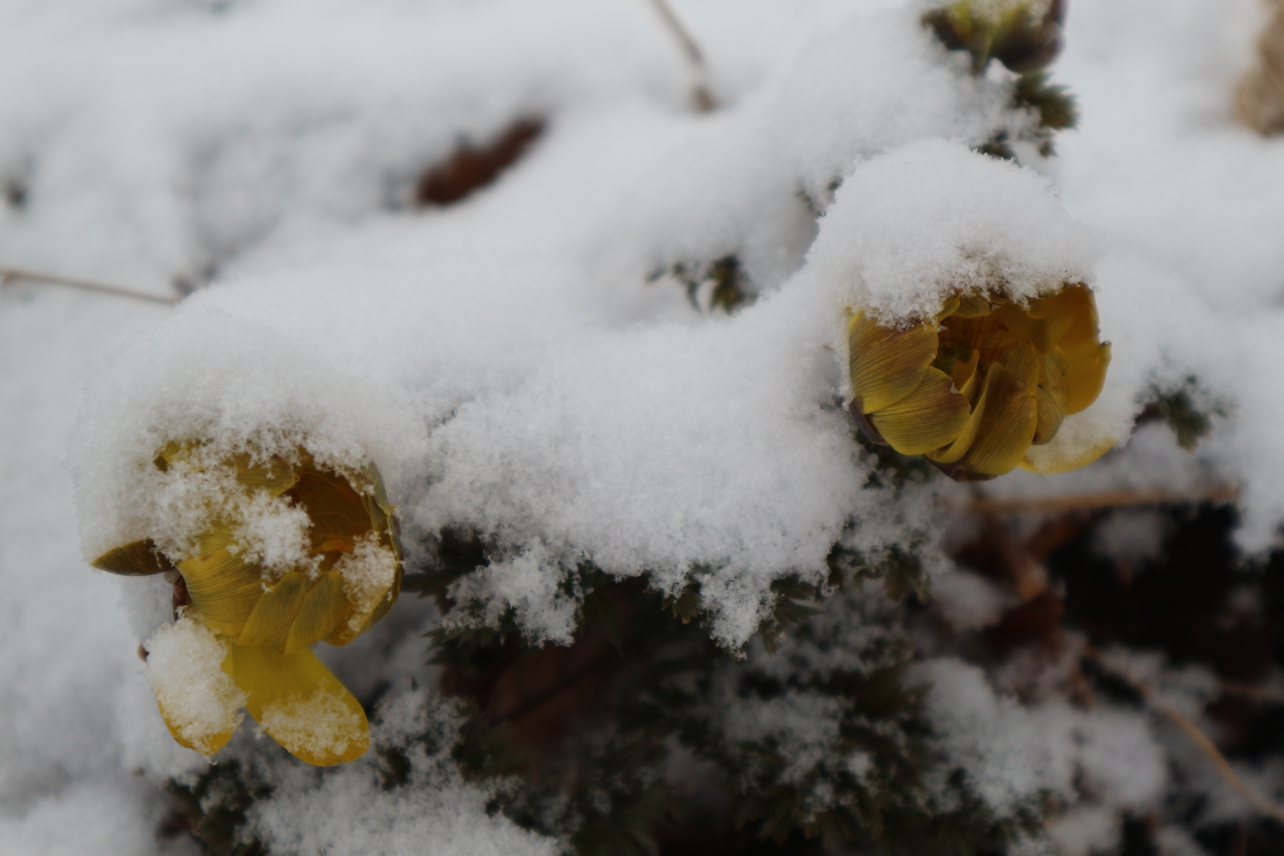 白い雪黄色い福寿草 まつり最終日