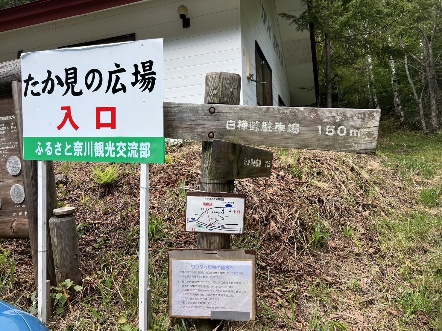 松本市街地から車で90分ほどで「たかの見の広場駐車場」に着きます。