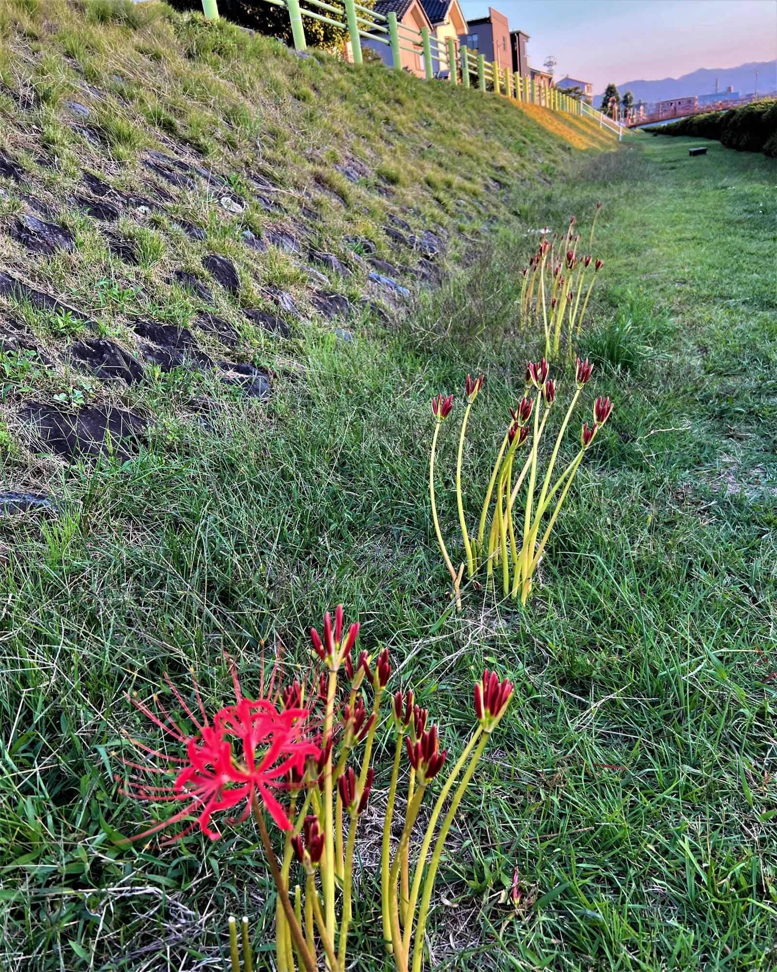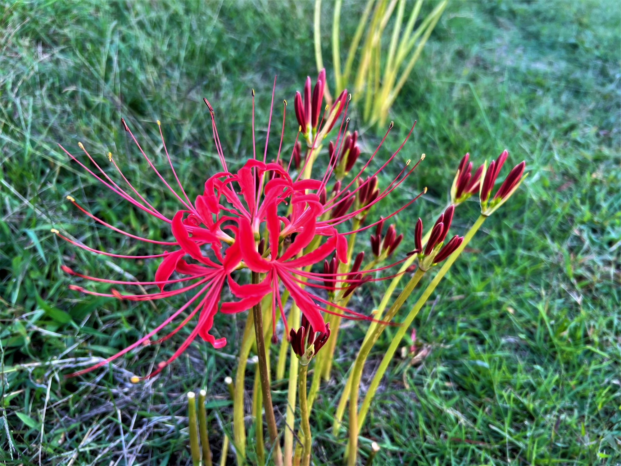 彼岸花が咲き続ける河原 彼岸花は、葉っぱがない