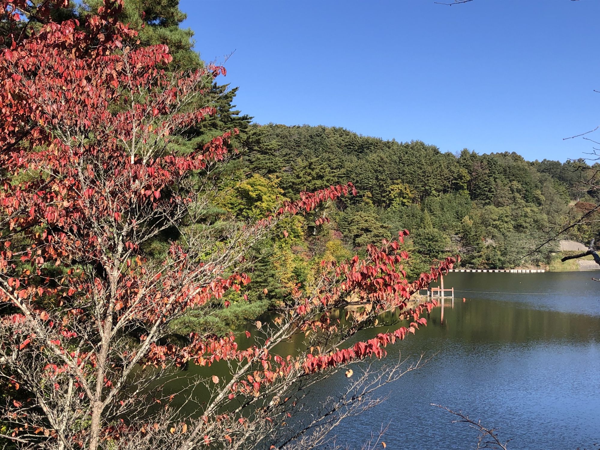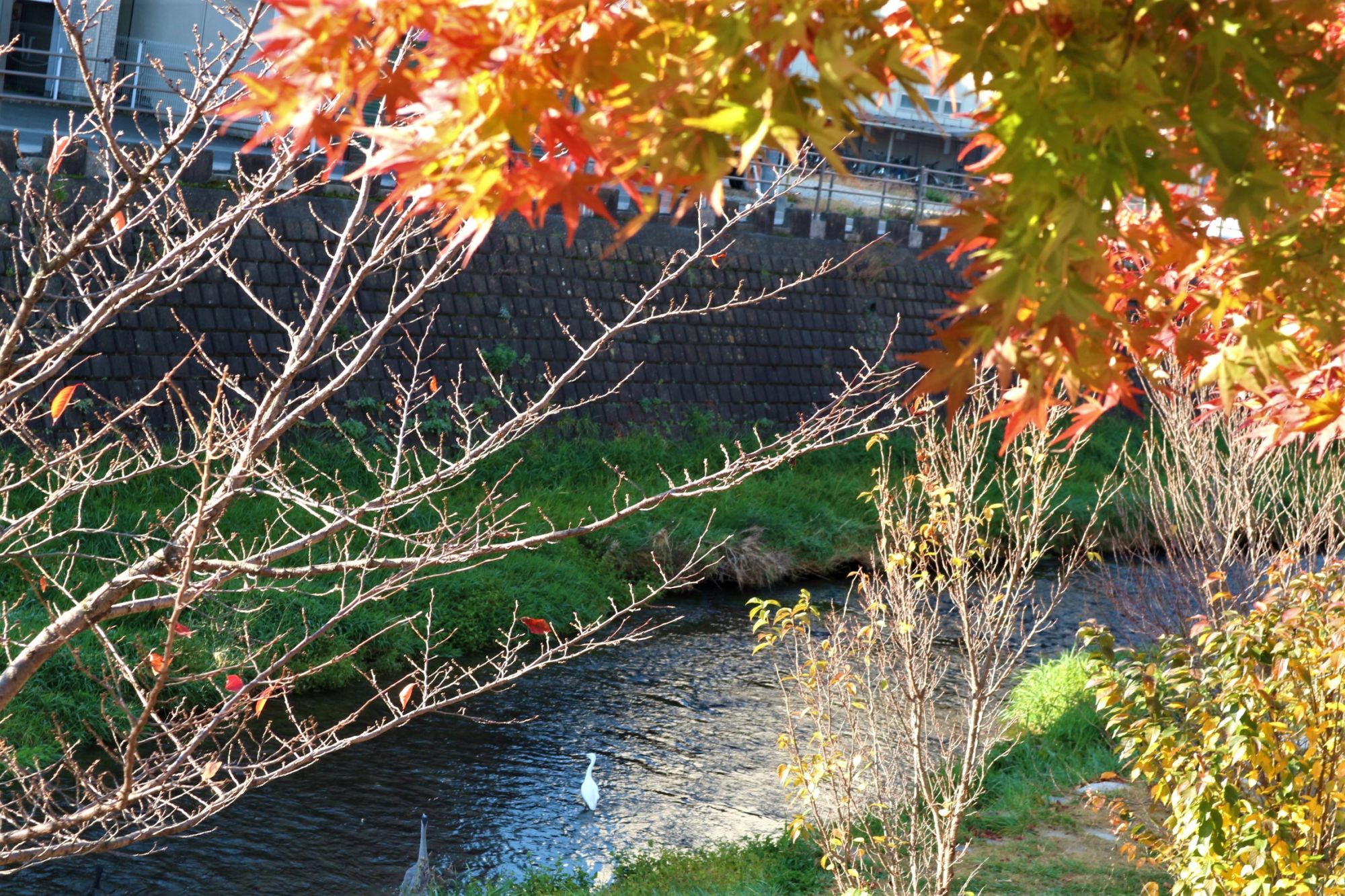 川沿いのもみじがまだ赤く色づいています。