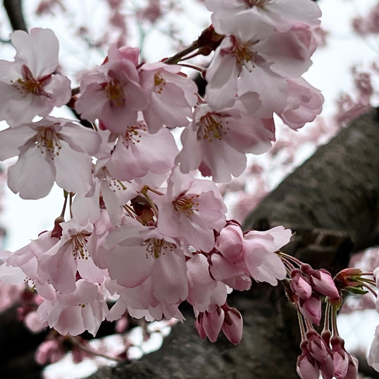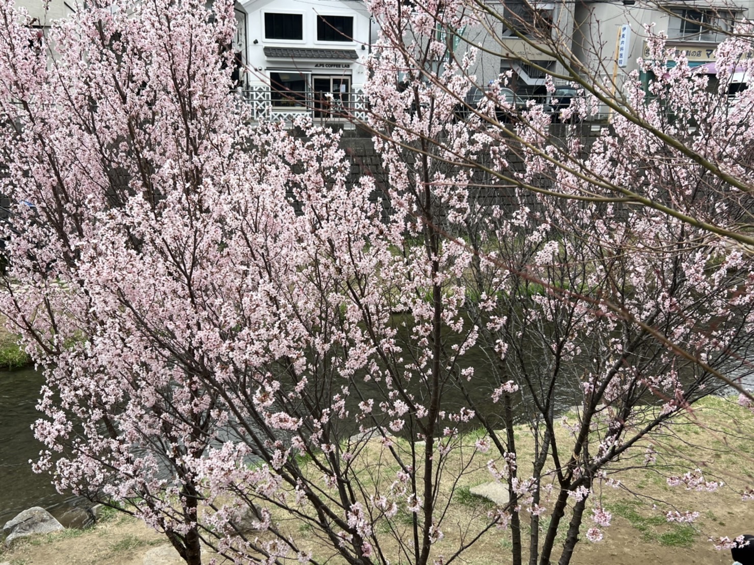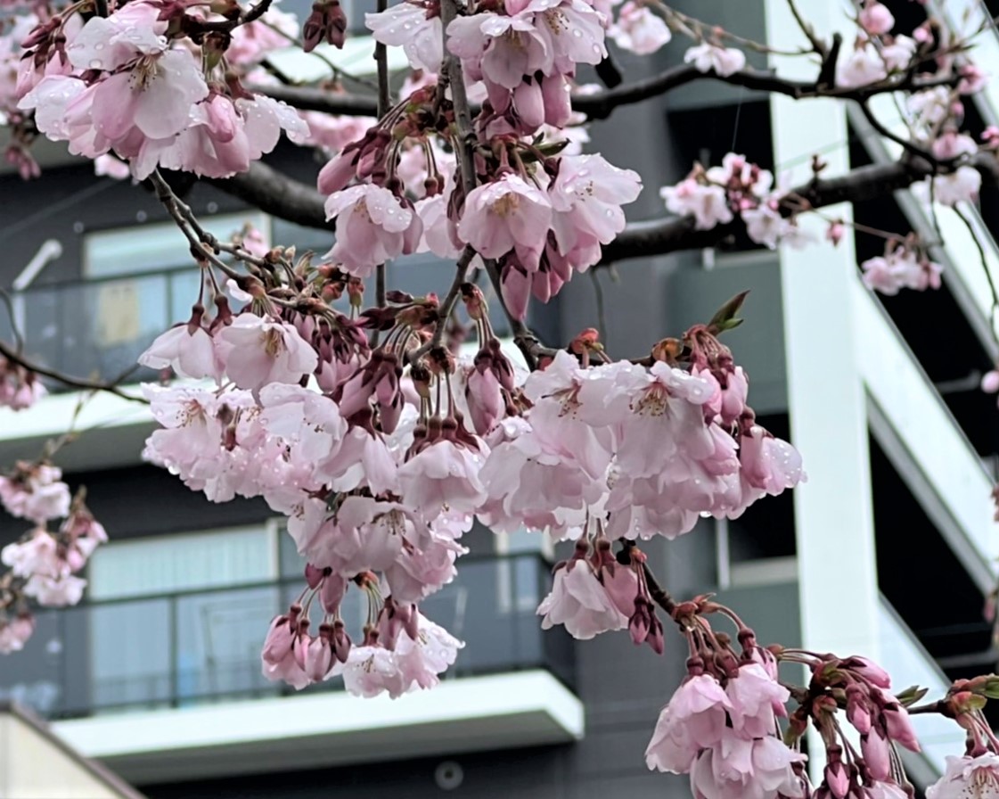 前日の初夏のような気温の上昇でよもやよもやと思いながら、辰巳の庭に行くとすでにコヒガンサクラが咲いていました。五分咲きです。