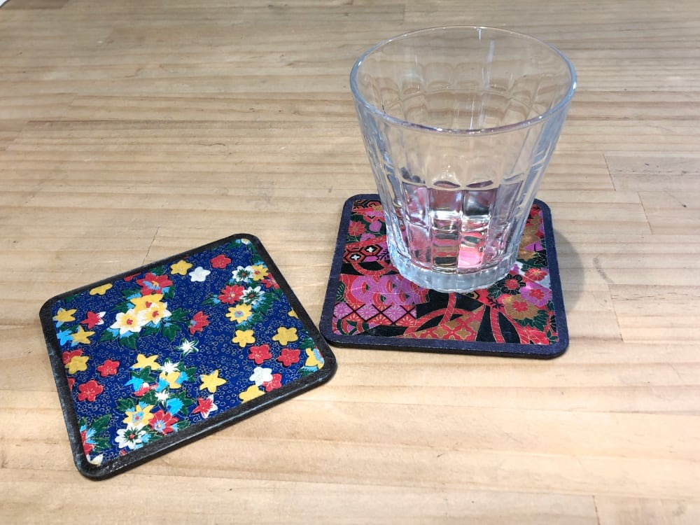 一閑張りの手法を用いて、木製コースターを2枚作ります。
