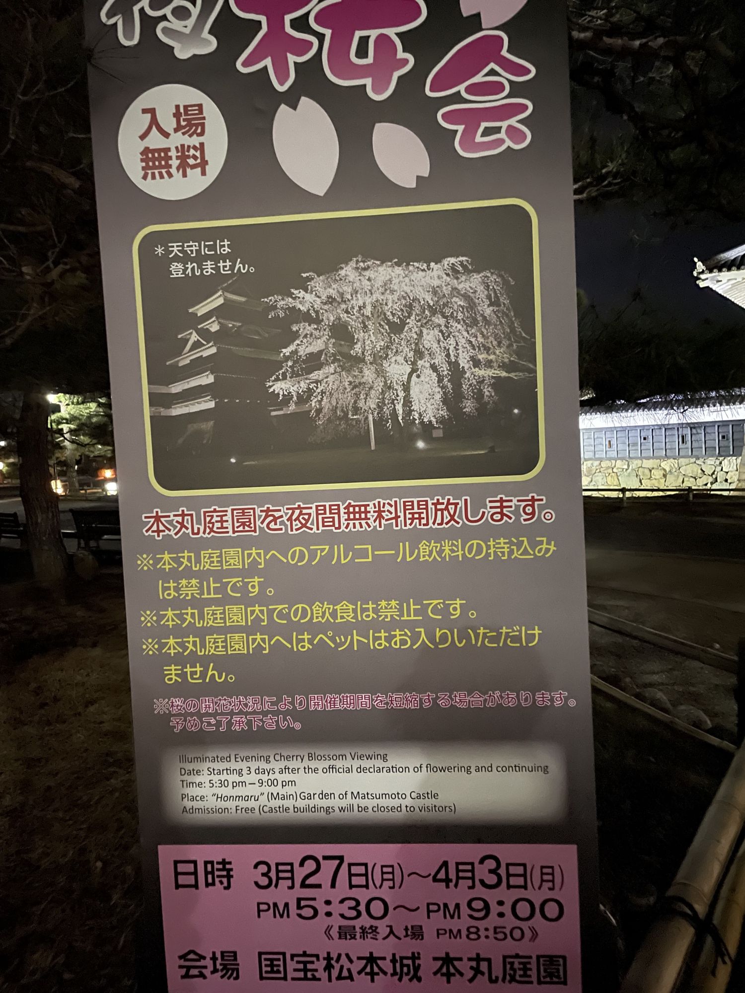 Несмотря на календарную весну, вечера в Мацумото все еще по зимнему холодные, поэтому отправляясь в замок одевайтесь потеплее.