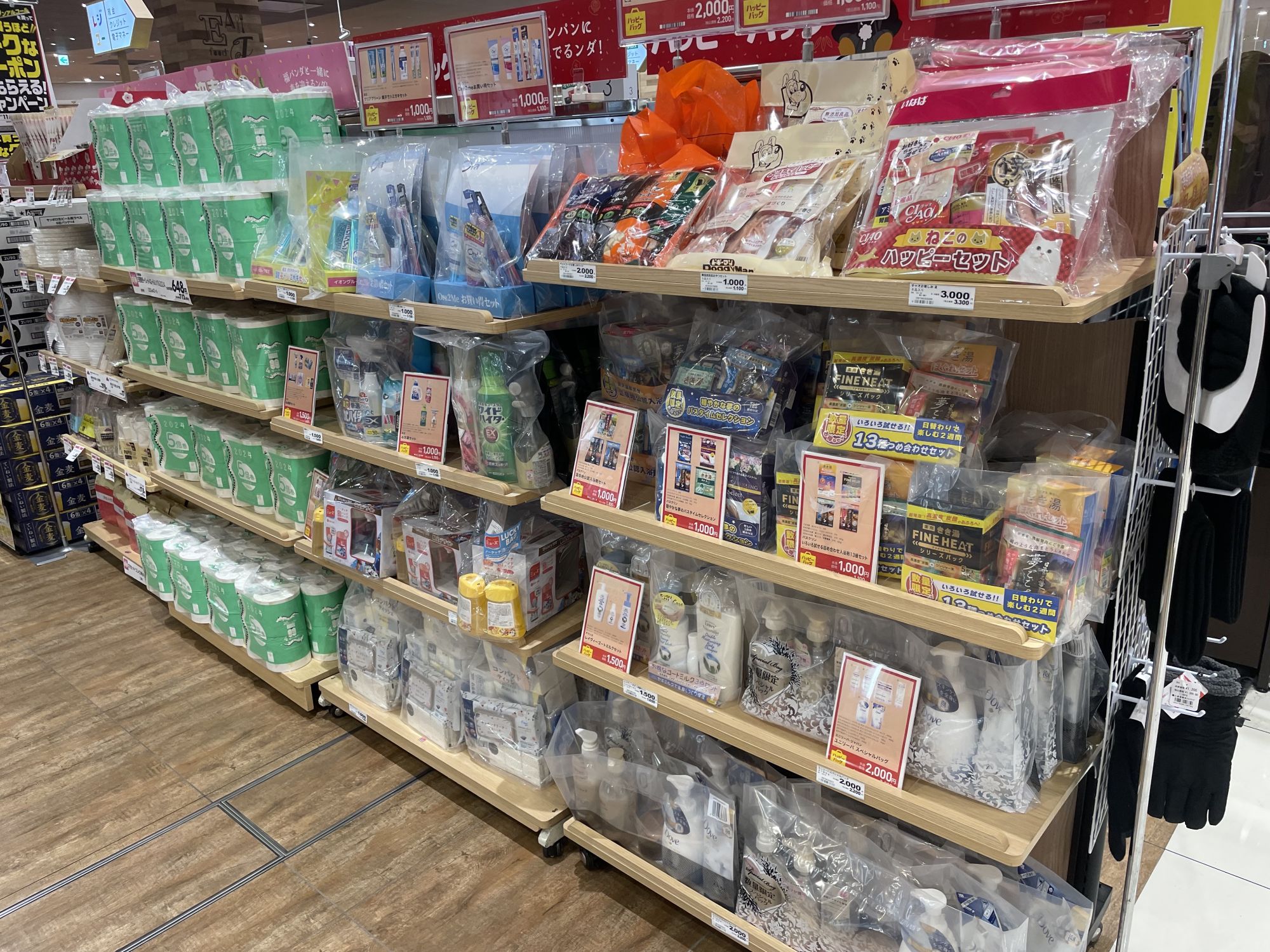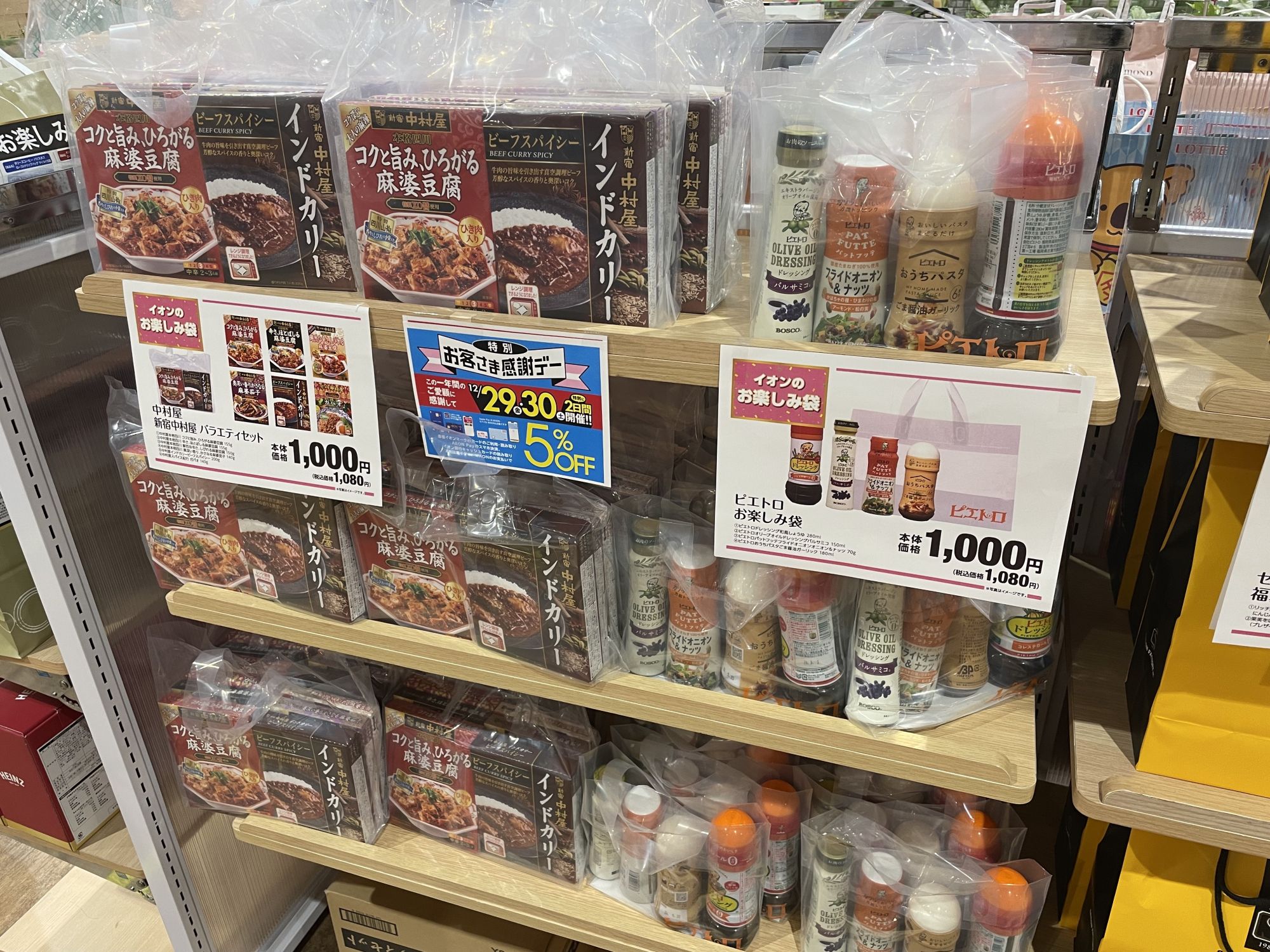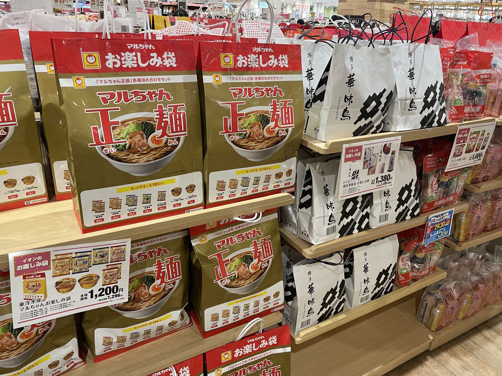 На первом этаже для «пакетов удачи» выделили целый отдел, где можно выбрать фукубукуро на любой вкус — с кофе или раменом, сладостями или соусами для салатов, снеками или витаминами.