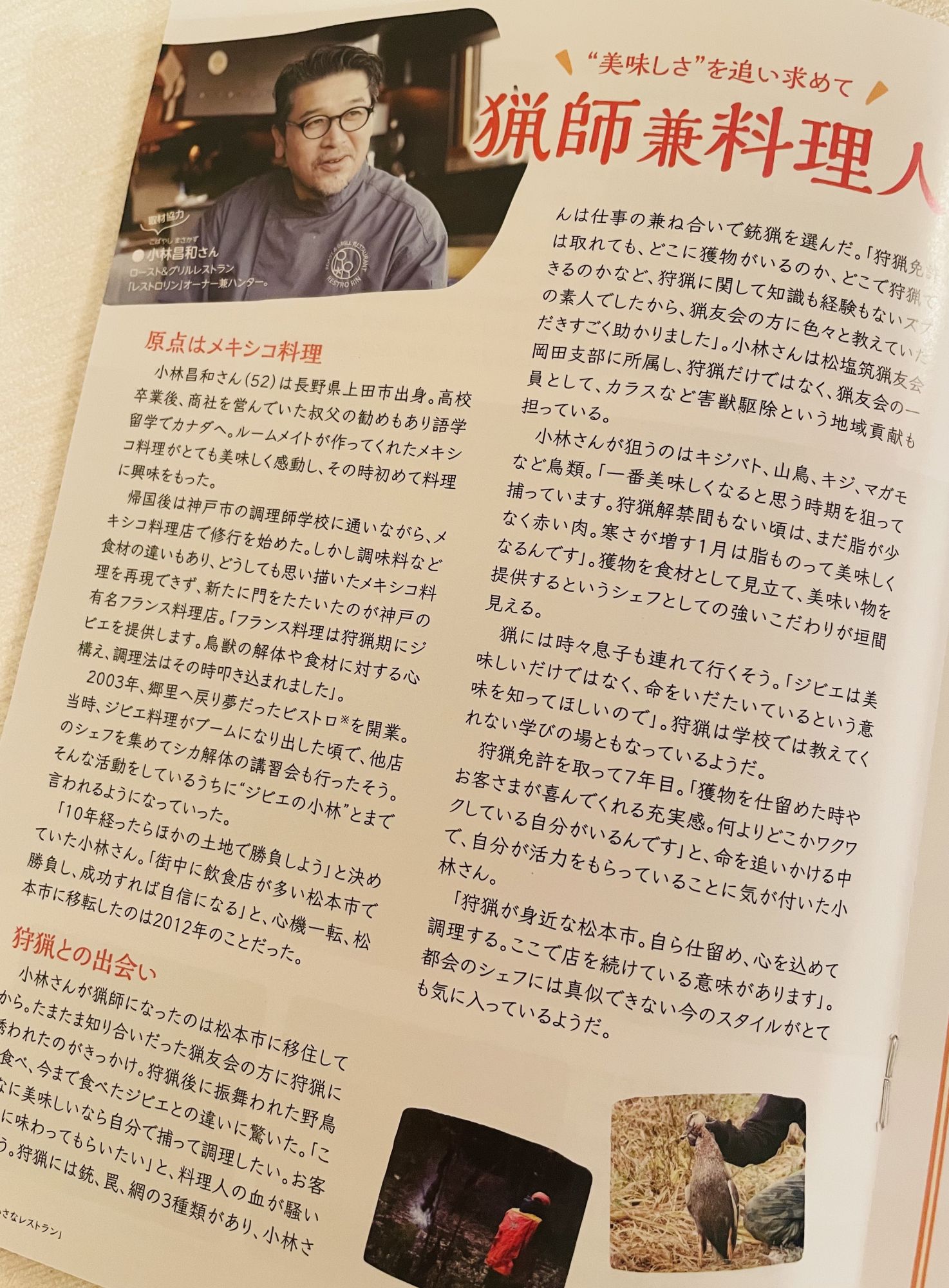 Переехав в Мацумото, мистер Кобаяси всерьез заинтересовался охотой. Дикие птицы — его страсть.  В его ресторане можно не только попробовать блюда из дичи и диких зверей, но и приобрести замороженную оленину.