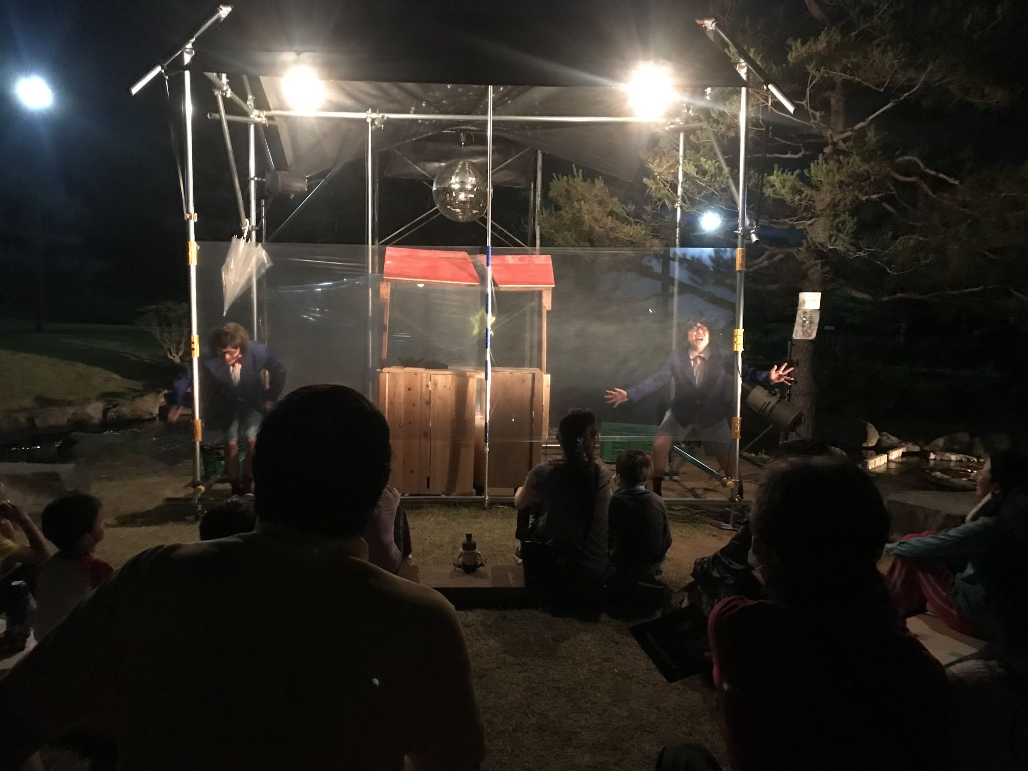 В отличии от предыдущего шоу, проходившее в этом же парке в октябре прошлого года, нынешняя постановка носит комедийный оттенок, всё действие которой проходит на небольшой деревянной сцене. COVID19 внёс свои коррективы во все сферы жизни и в театральную жизнь в том числе. Чтобы снизить риск заражения, сцену пришлось обтянуть и огородить от зрителей прозрачной пленкой. Ну а ношение масок в общественных местах, похоже, стало нормой нашего времени.