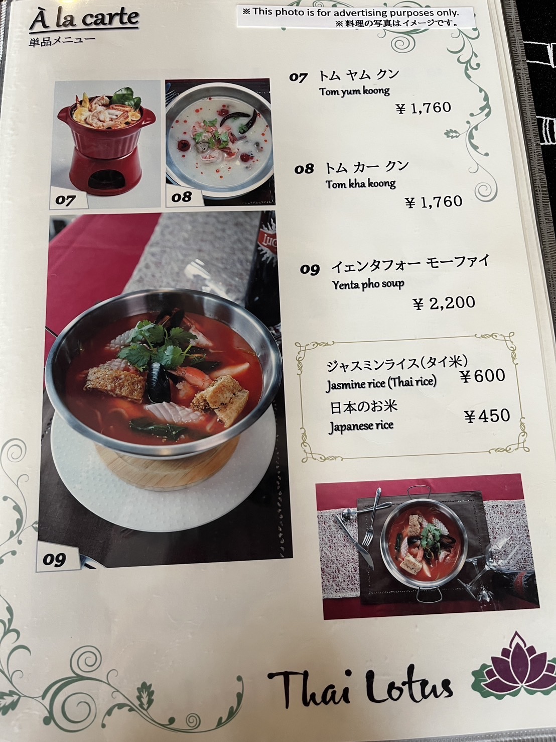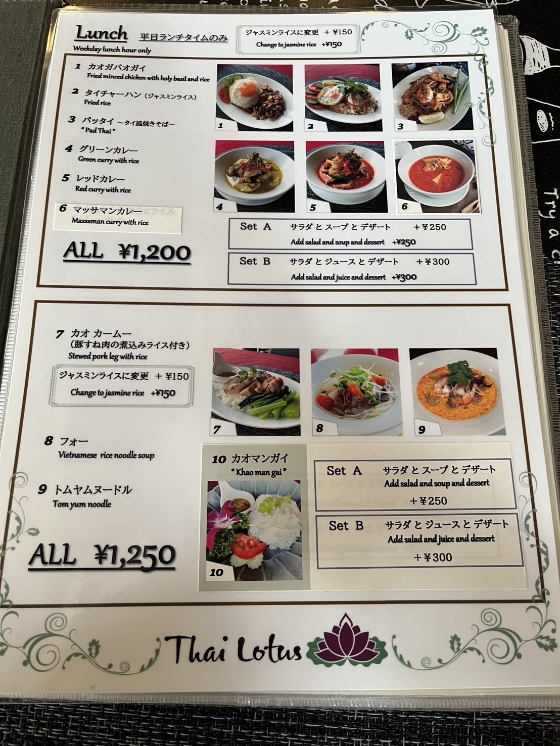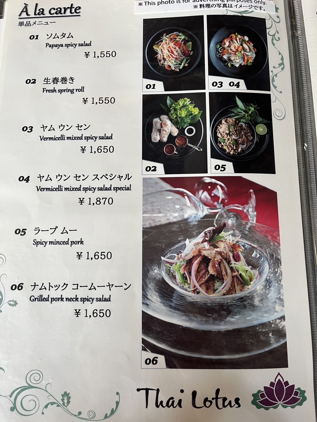 Меню включает классические тайские блюда: Пад Тай (Pad Thai) и красное карри с курицей, Том Ям, зеленый карри и пряные обжаренные с морепродуктами блюда, Весенние роллы с креветками, жареное филе рыбы или мяса, салаты Yam Wun Sen, говядина с овощами. На ужин — ассортимент десертов к основному сету.