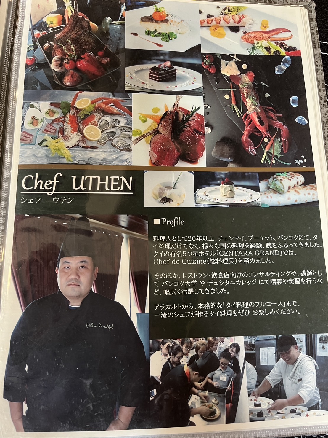 Шеф-повар Uthen, имеющий более 20 лет опыта: работал и преподавал в таких местах, как Chiang Mai, Phuket и Bangkok, включая знаменитый отель Centara Grand в Таиланде. Он специализируется на аутентичной тайской кухне и предлагает как изысканные, продуманные до мелочей сеты, так и индивидуальные блюда