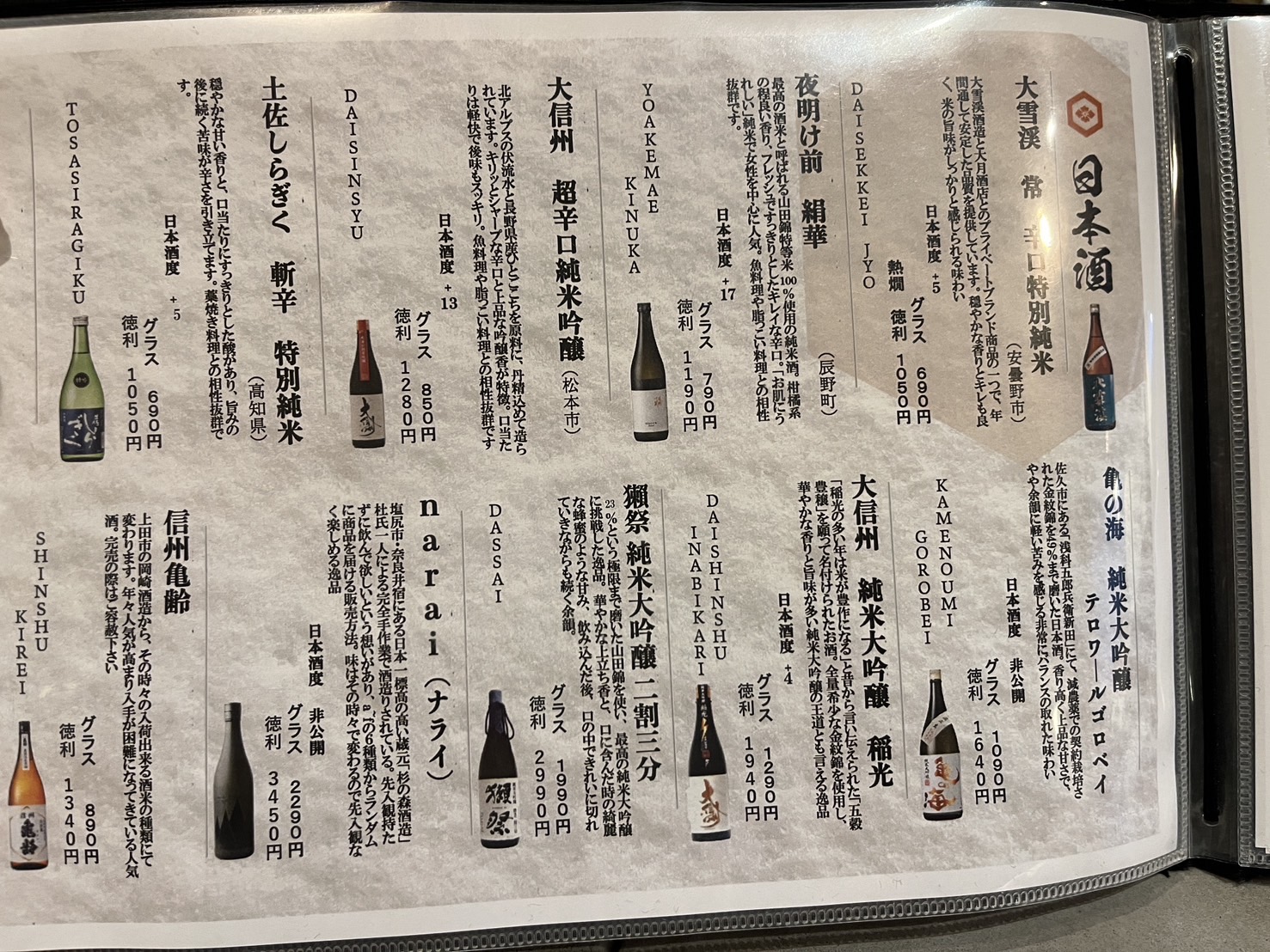 Основной акцент — блюда, приготовленные методом варияки (藁焼き): солома используется для обугливания поверхности продуктов, чаще всего тунца, сыра или местных мясных деликатесов. Такая техника придаёт лёгкий дымный аромат и выделяет вкусовую глубину ингредиентов.