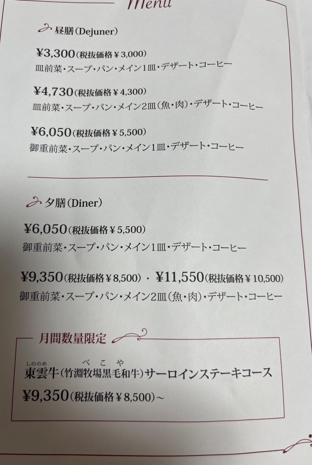 Обеденный курс (~¥2 750–3 300): включает суп из сезонных овощей, разнообразные закуски, рыбу или мясо, десерт и кофе/чай. Часто рекомендуют премиальный вагю стейк или тушёное мясо.
