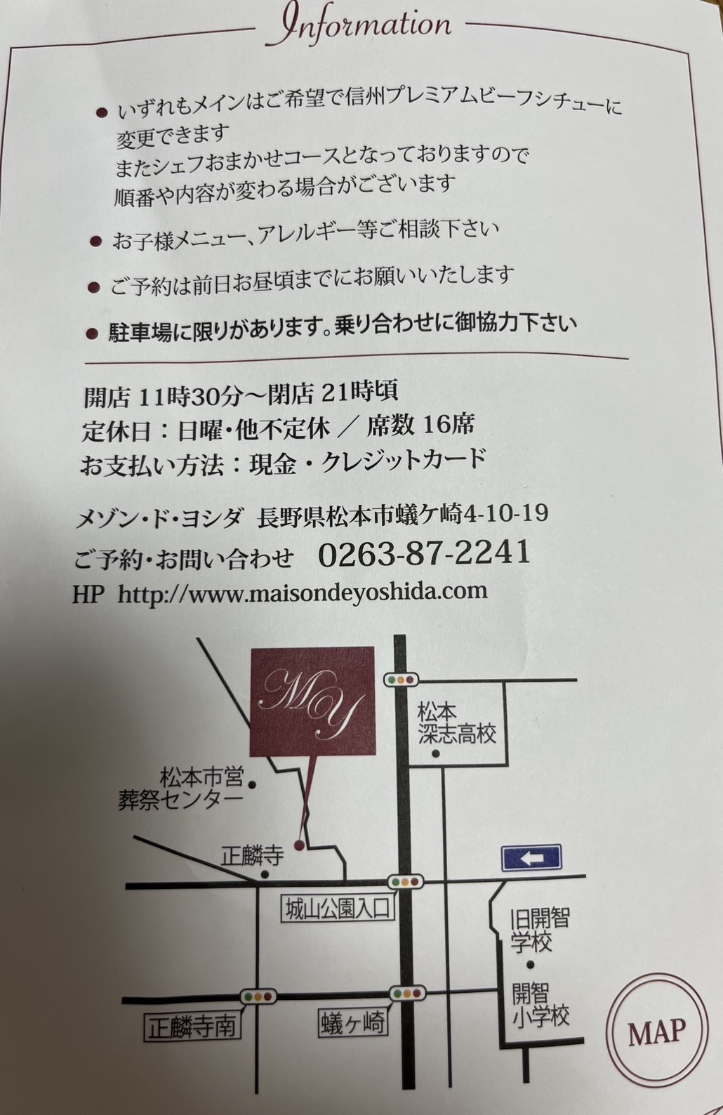 Maison de Yoshida (メゾン・ド・ヨシダ) — уютный ресторан французской кухни в Мацумото, где блюда адаптированны для местных жителей и подаются так, чтобы их можно было есть палочками. Это авторский стиль, сочетающий французские традиции и японскую эстетику.