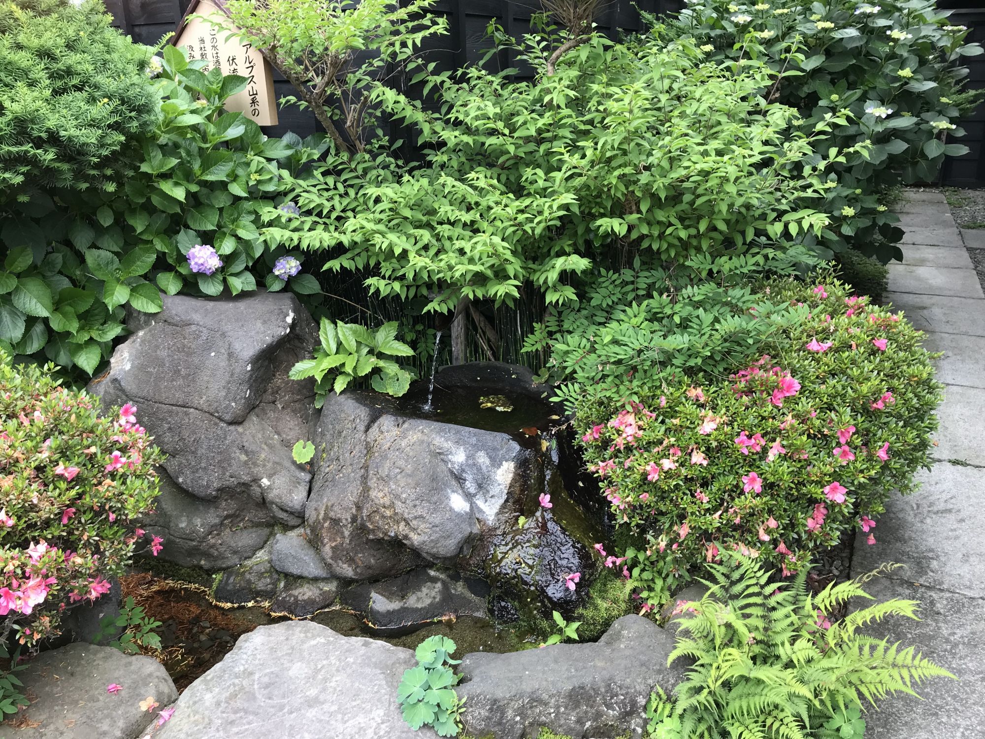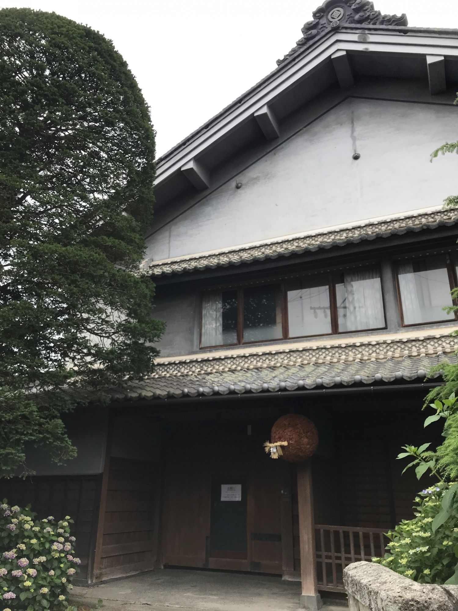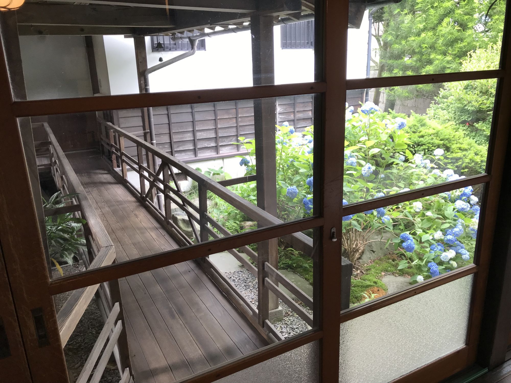 Дом построен в лучших традициях 19го века, из больших окон деревянной трассы открывается вид на уютный японский садик. Сейчас , в сезон дождей здесь цветёт прекрасная гортензия. Стоит отметить, что сад специально был разбит в северной части дома, что бы обжигающие солнечные лучи не попадали в окна, а преломляясь о высокую крышу строения мягко освещали зеленое убранство. Деревянная дорожка — мостик ведет из дома в соседнее здание.