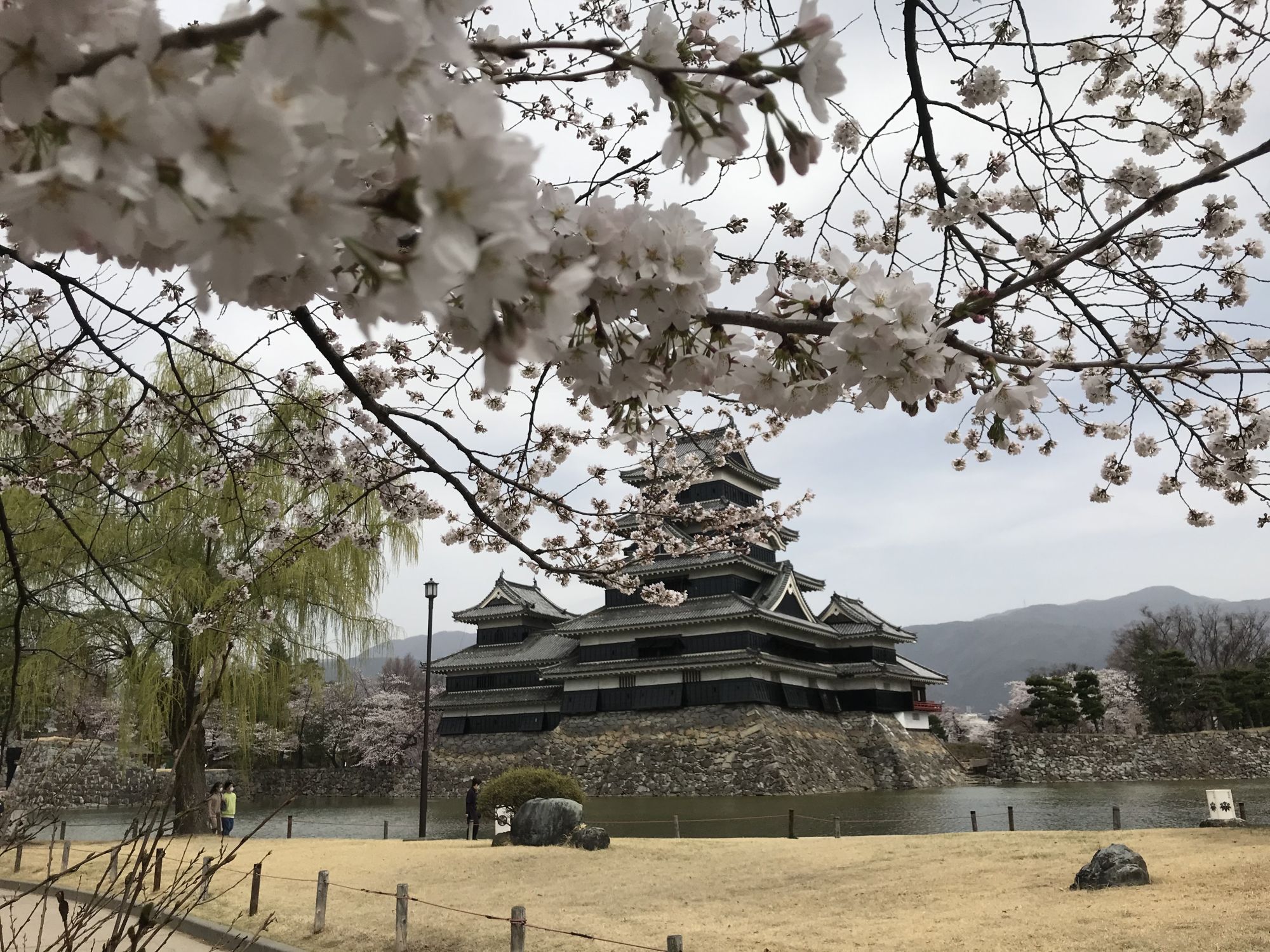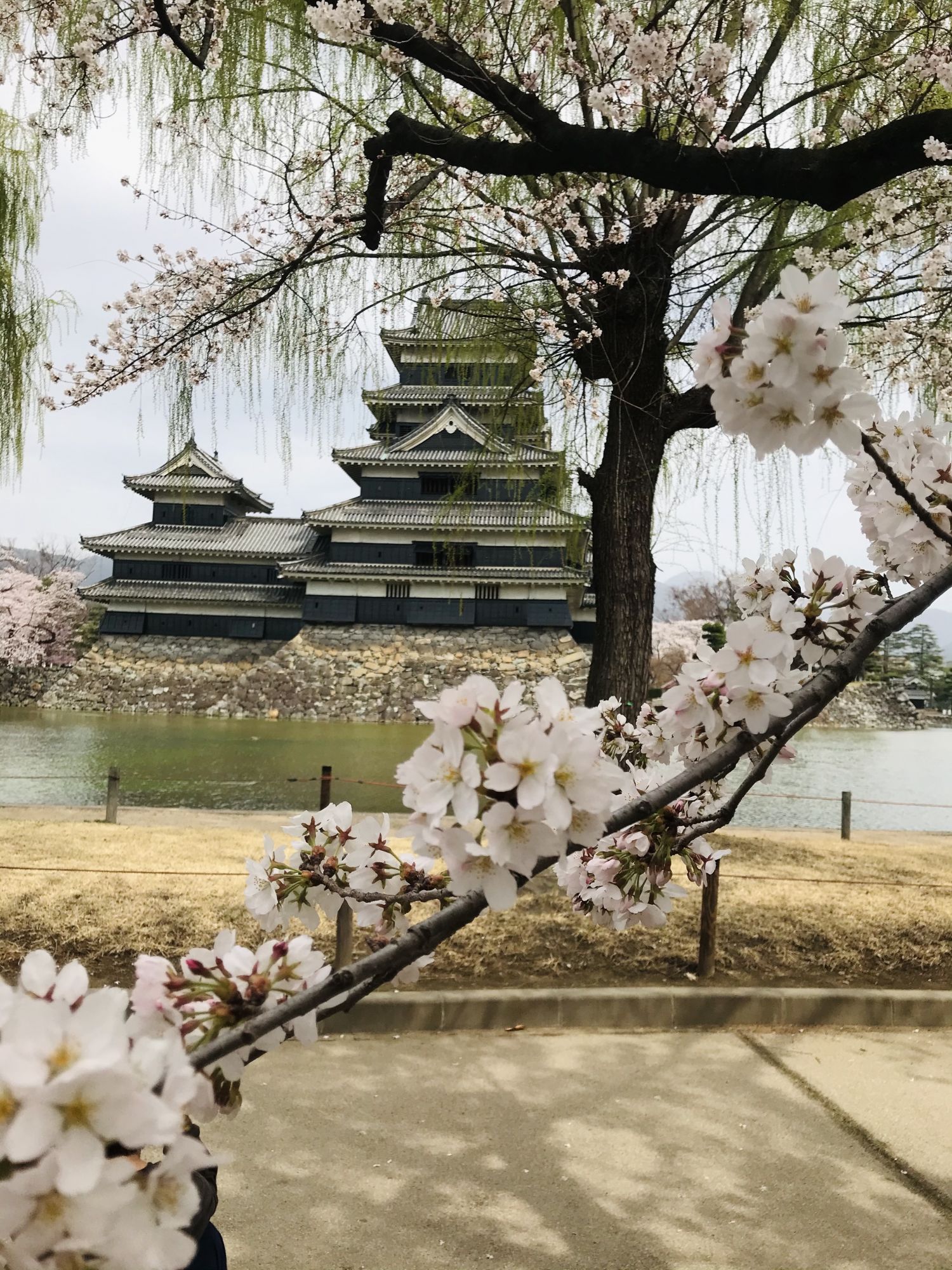 Замок Мацумото, как всегда завораживает картинными видами на фоне розовых облаков сакуры.