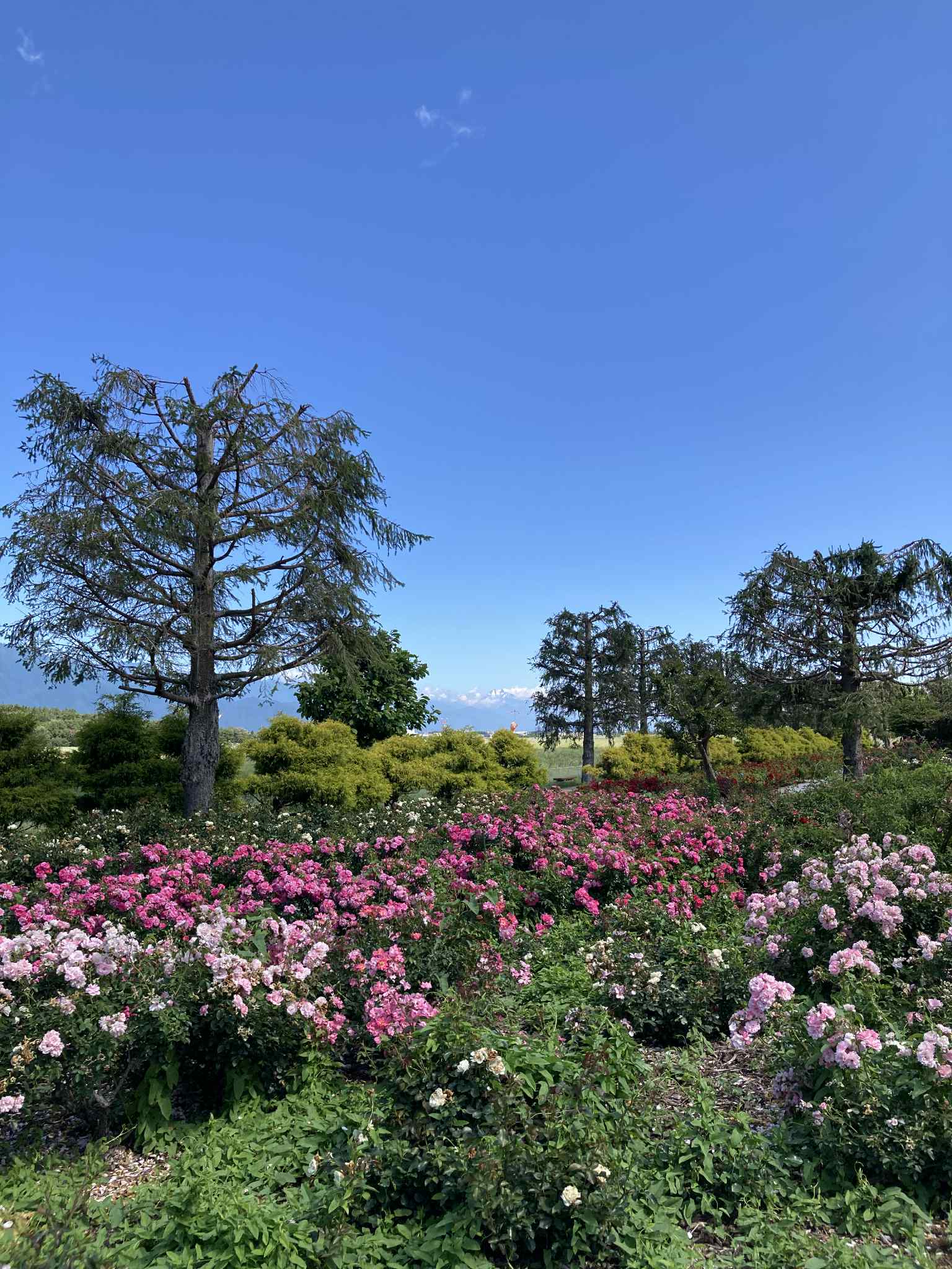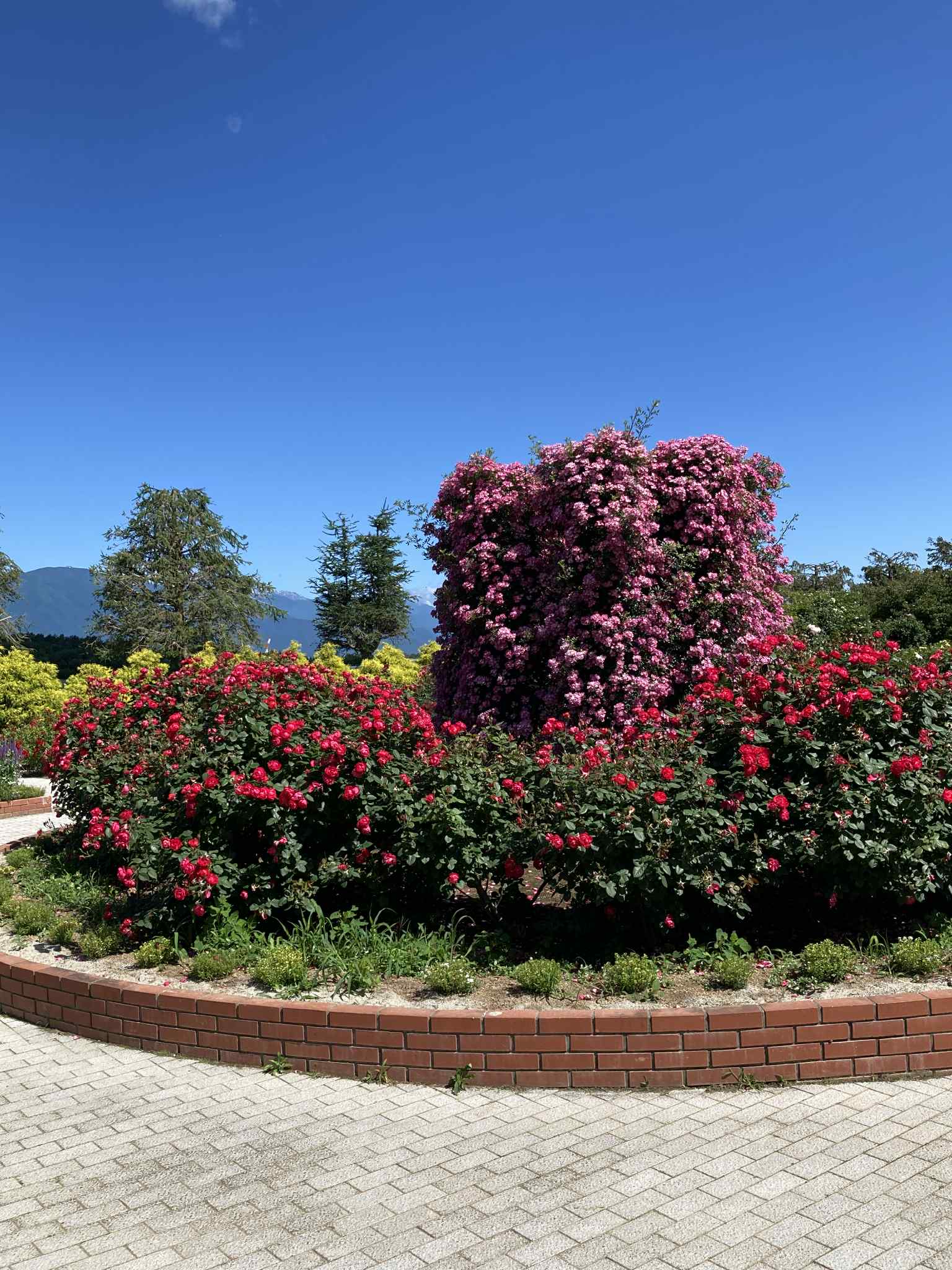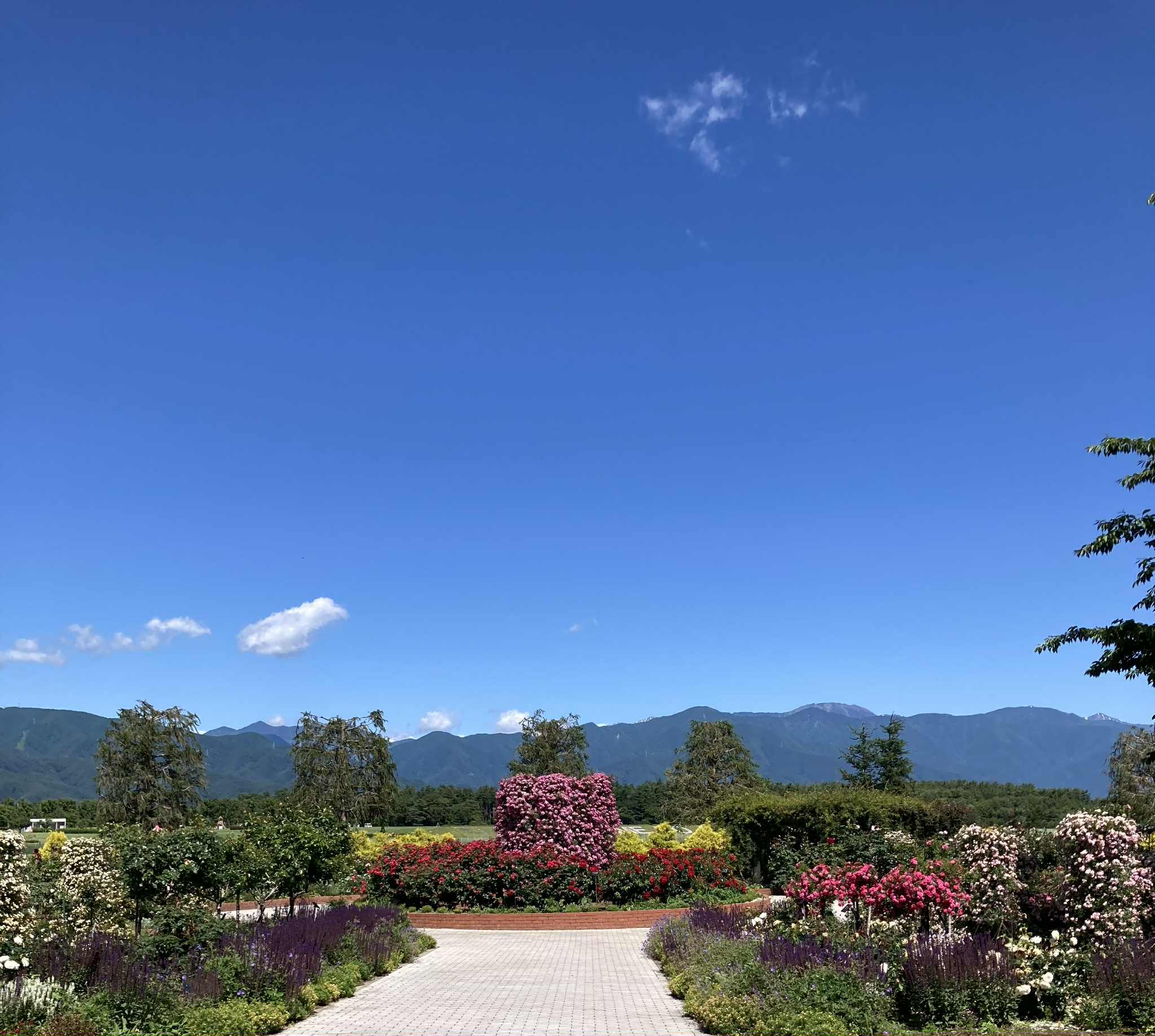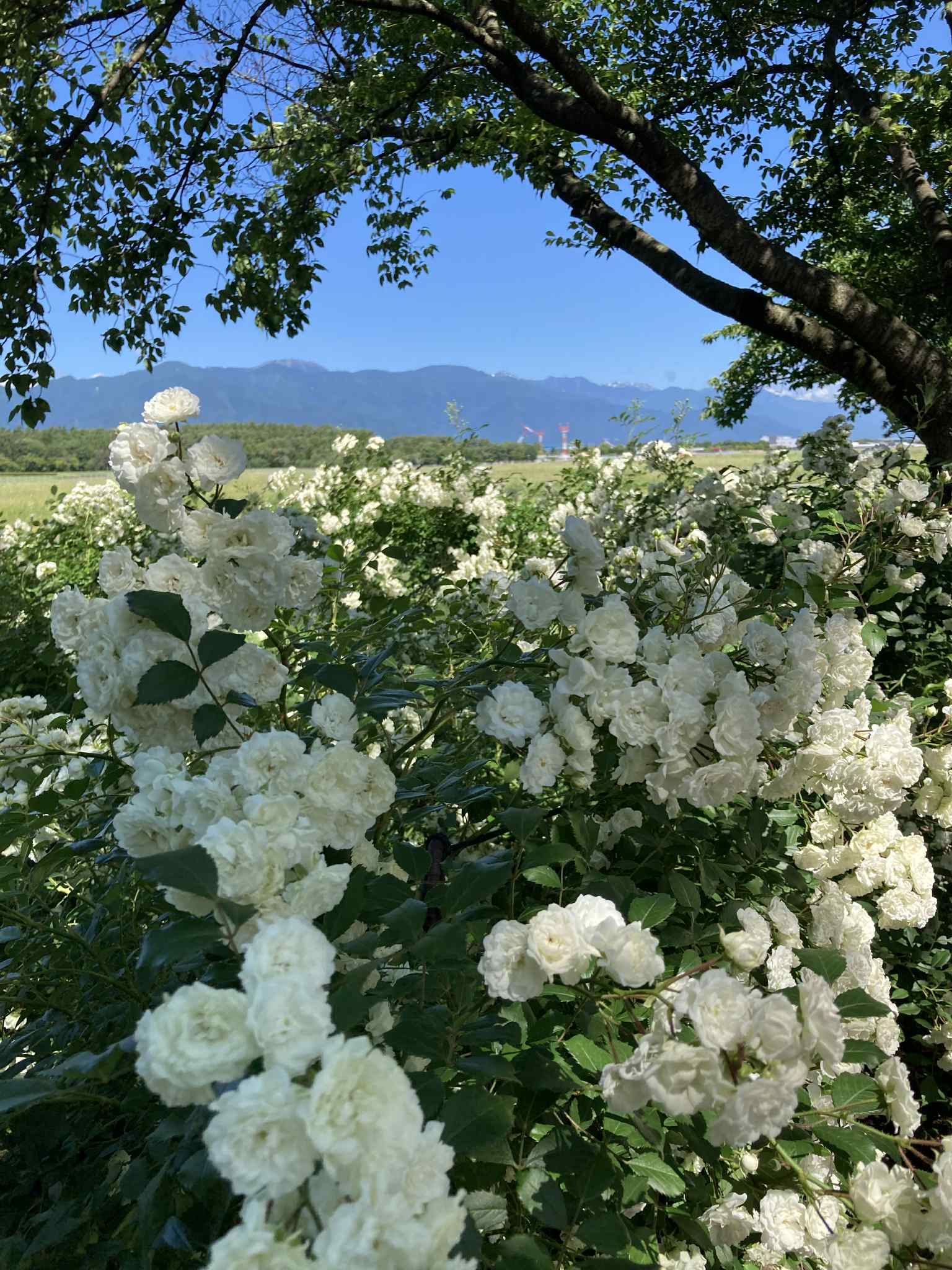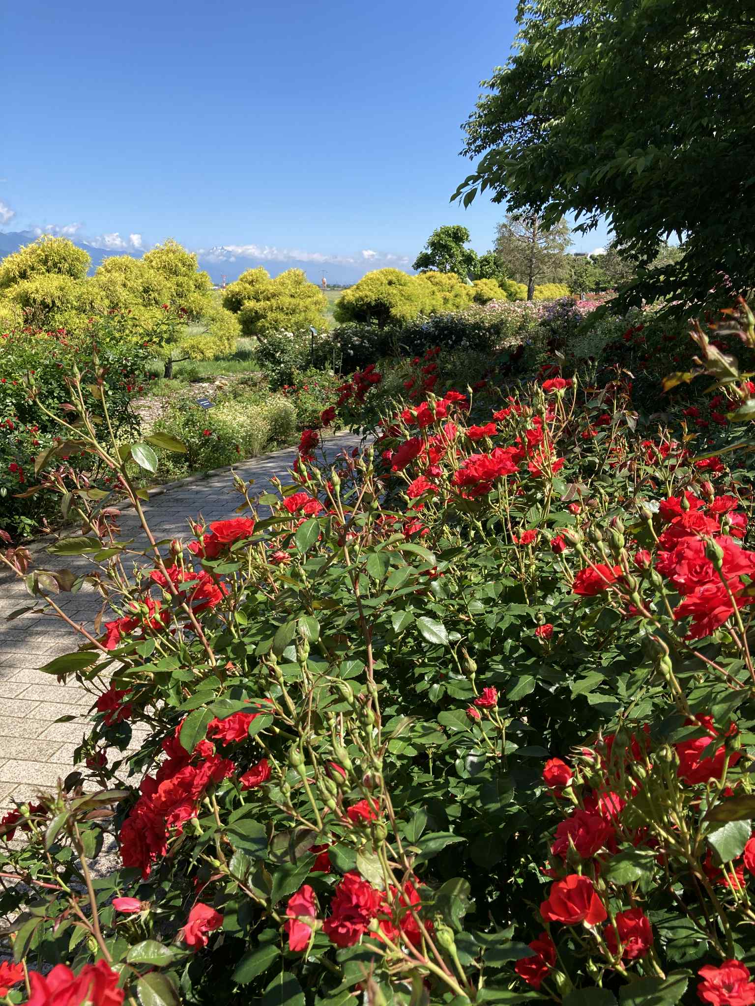 В конце мая – начале июня в саду роз Skyパーク в Мацумото (信州スカイパーク, Shinshu Sky Park) начинается цветение роз, и сейчас здесь во всю цветут ранние сорта. В частности, жёлтая двойная роза «モッコウバラ» (Mokkou‑bara), создающая живописный арочный тоннель, уже в полном цвету и манит ароматами.
