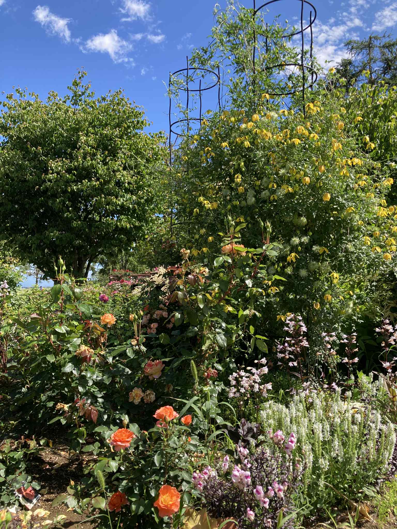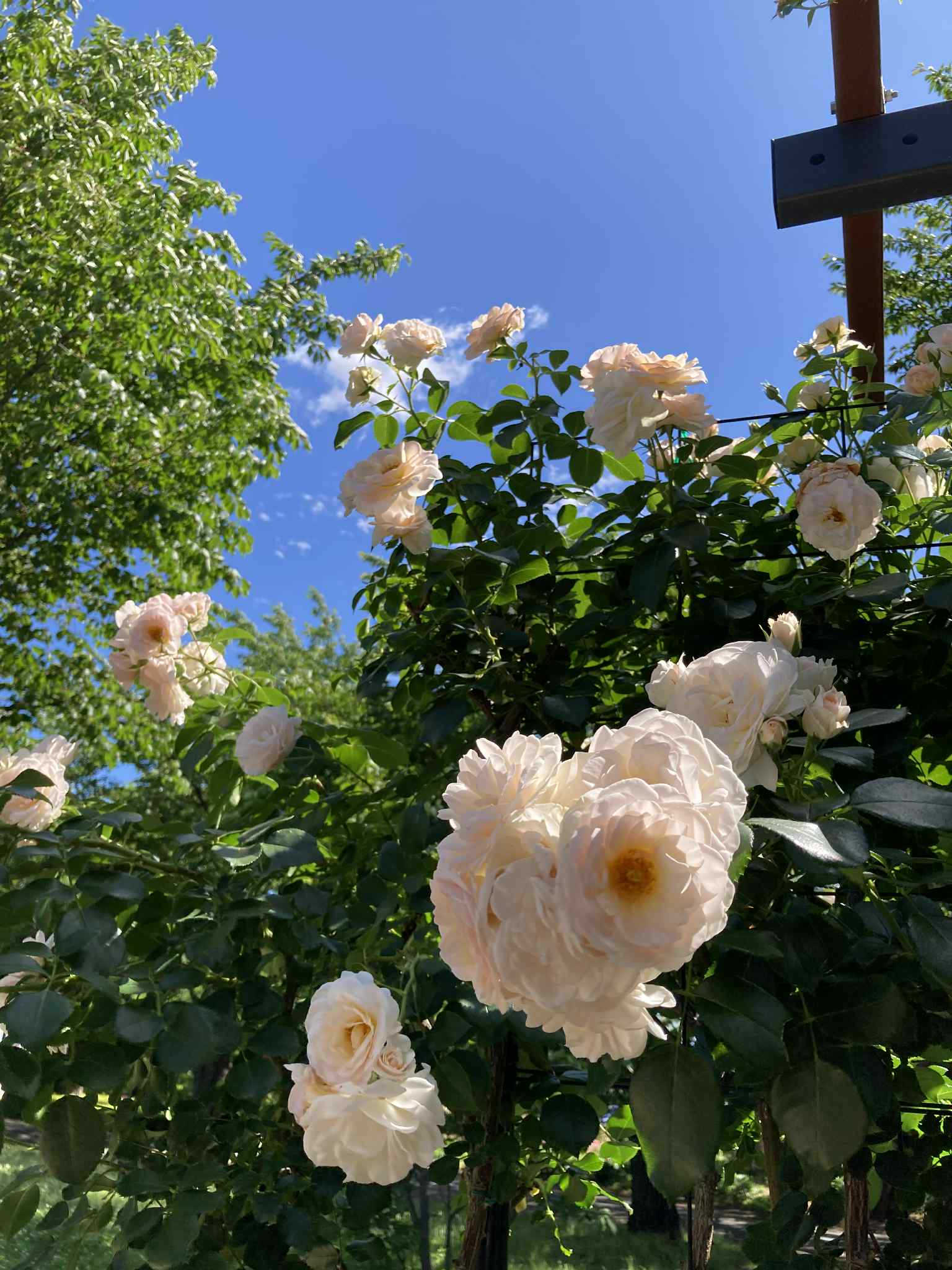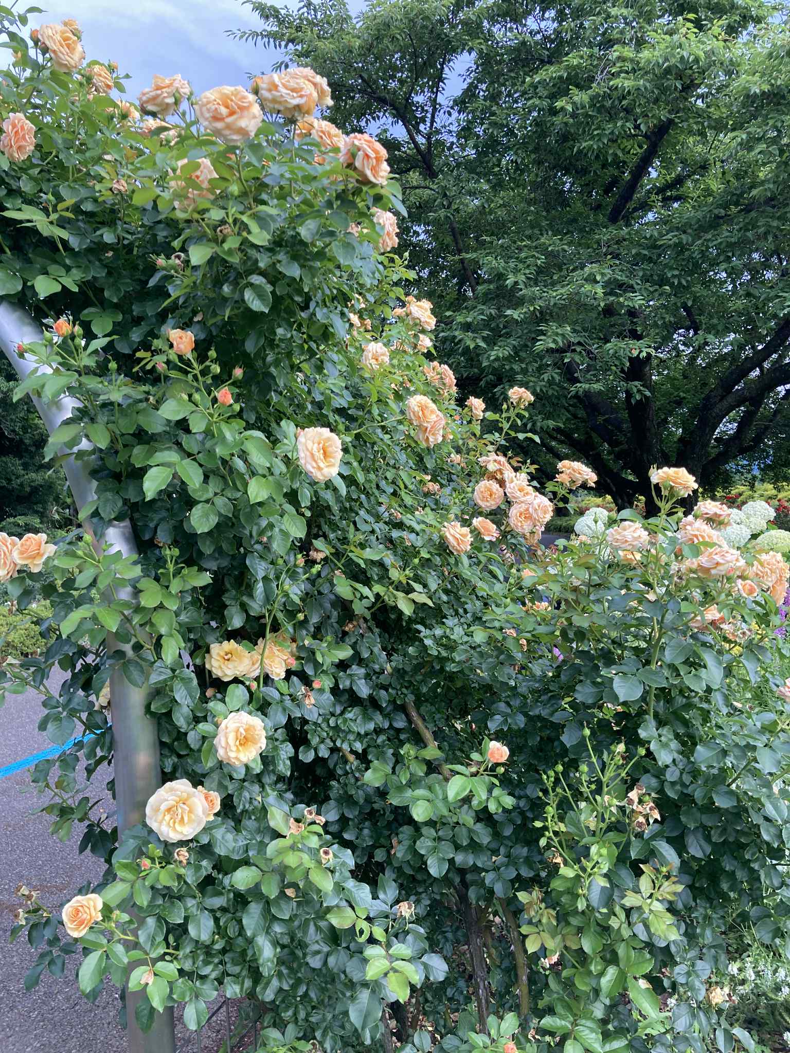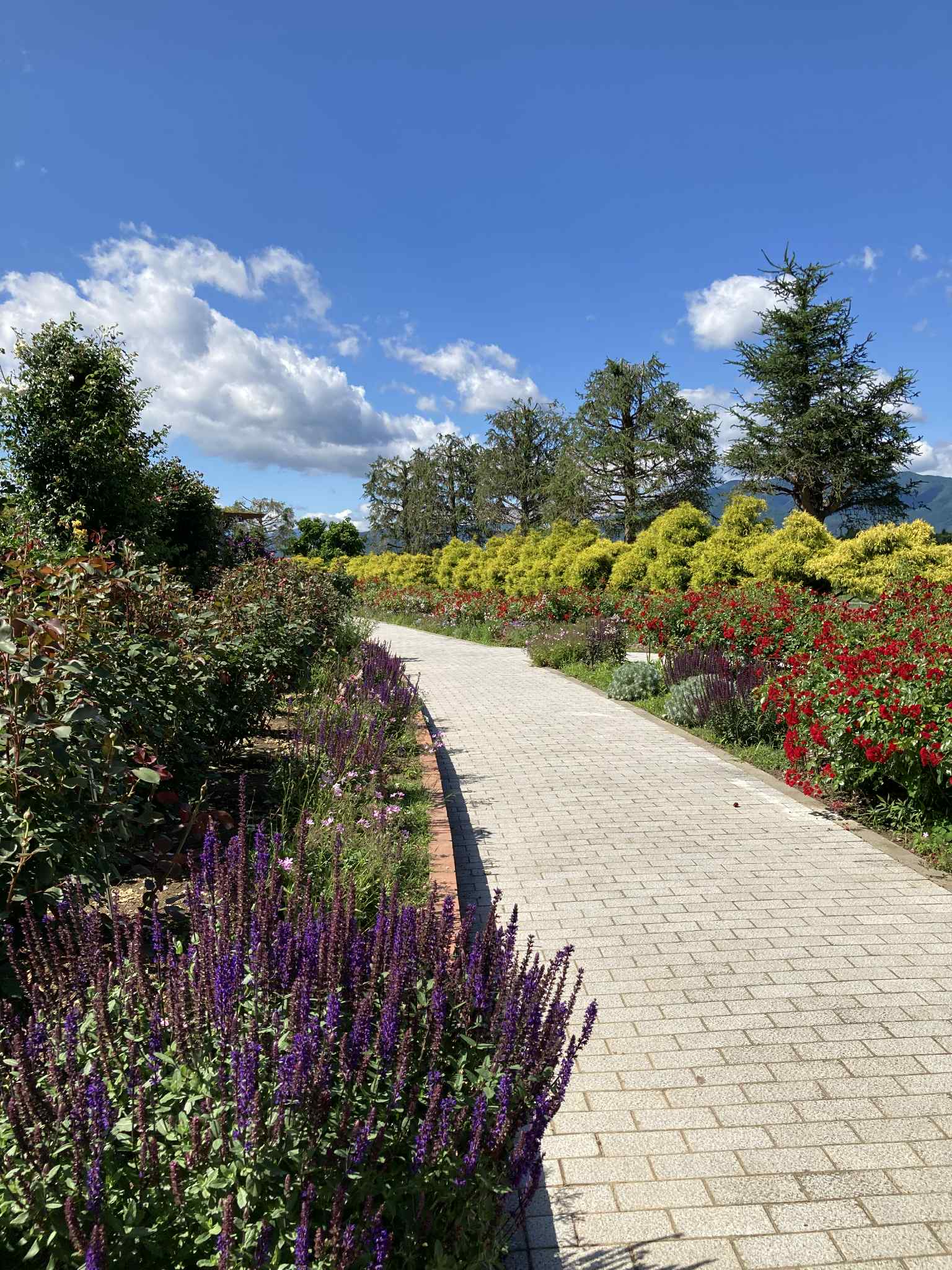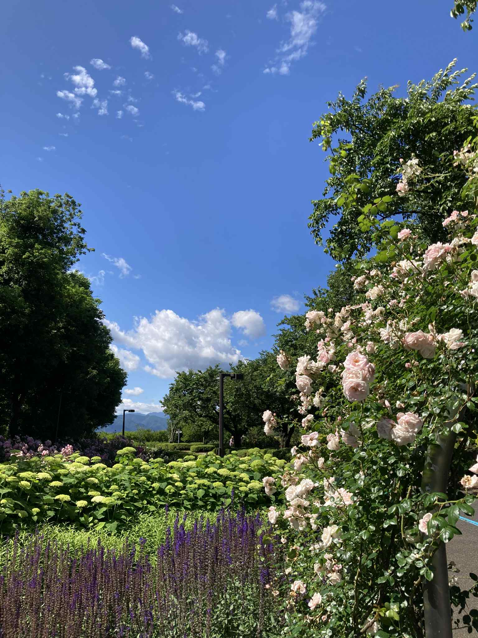 В конце мая – начале июня в саду роз Skyパーク в Мацумото (信州スカイパーク, Shinshu Sky Park) начинается цветение роз, и сейчас здесь во всю цветут ранние сорта. В частности, жёлтая двойная роза «モッコウバラ» (Mokkou‑bara), создающая живописный арочный тоннель, уже в полном цвету и манит ароматами.