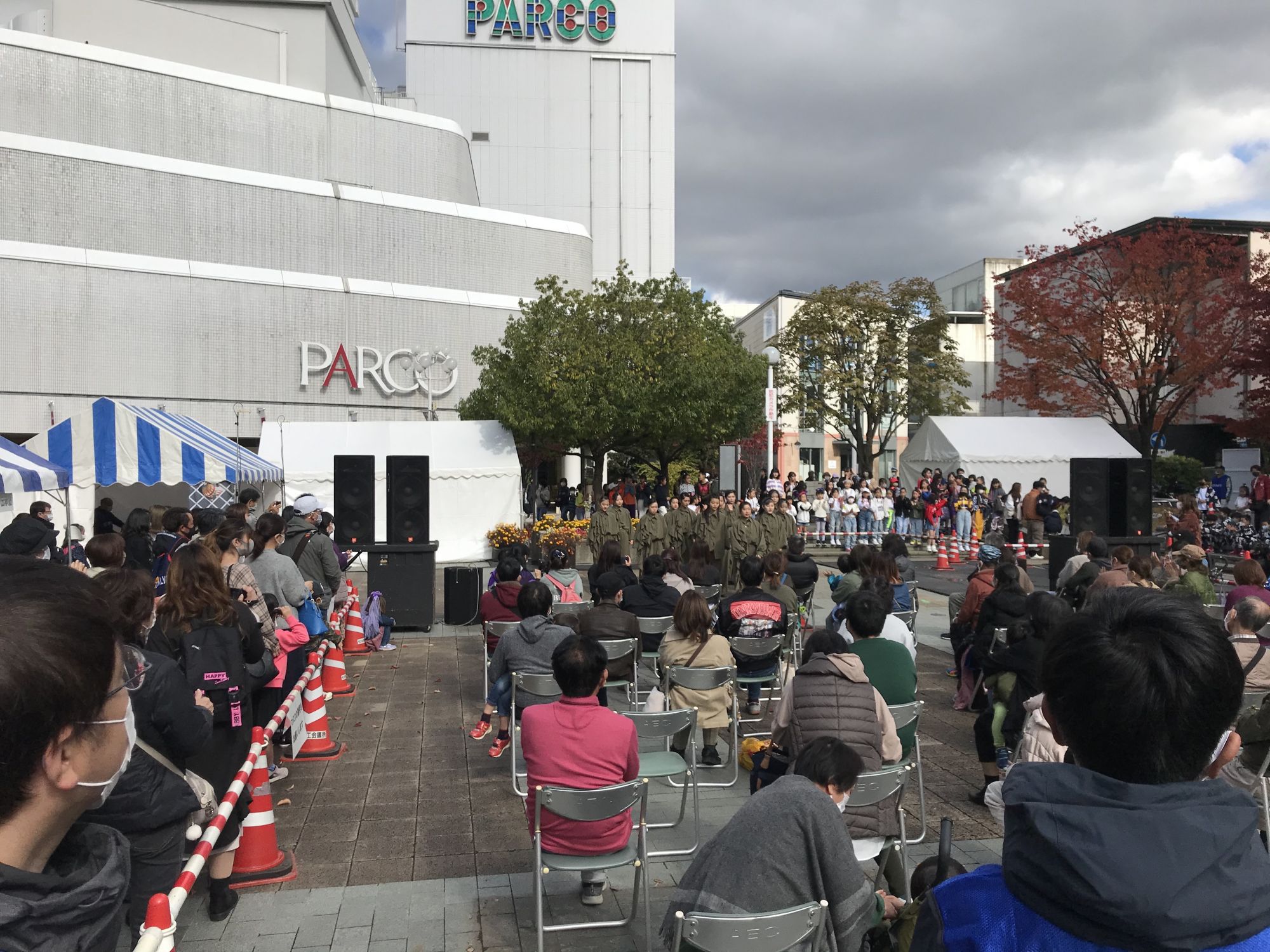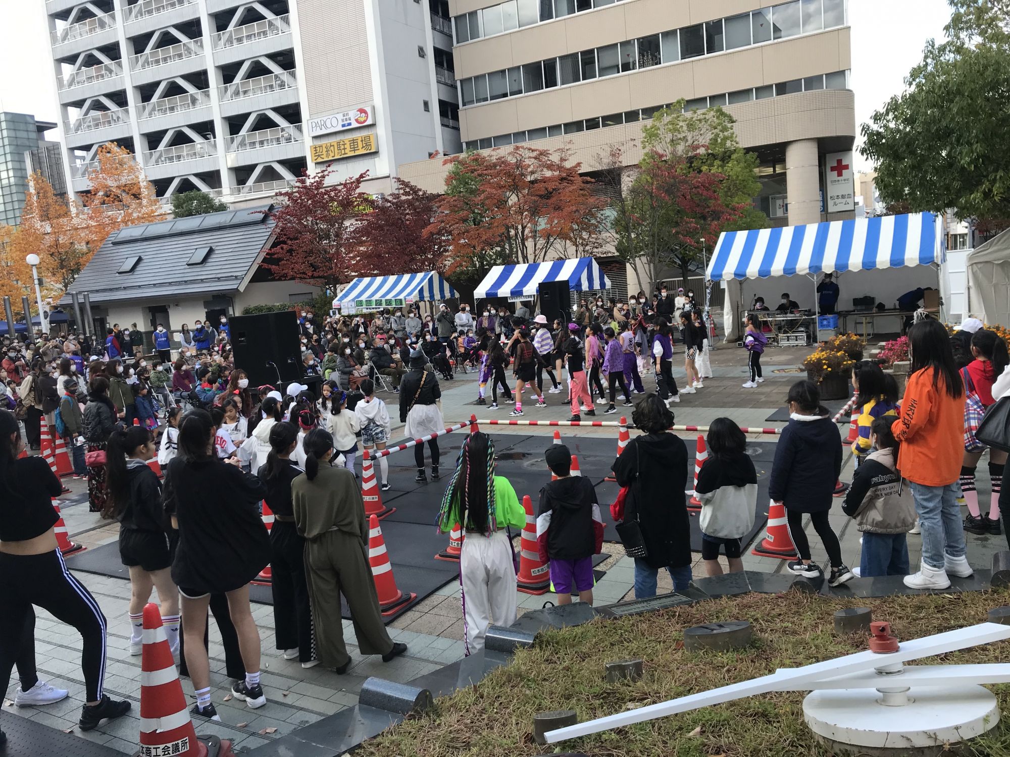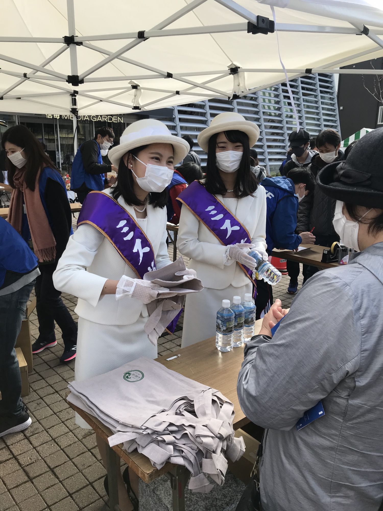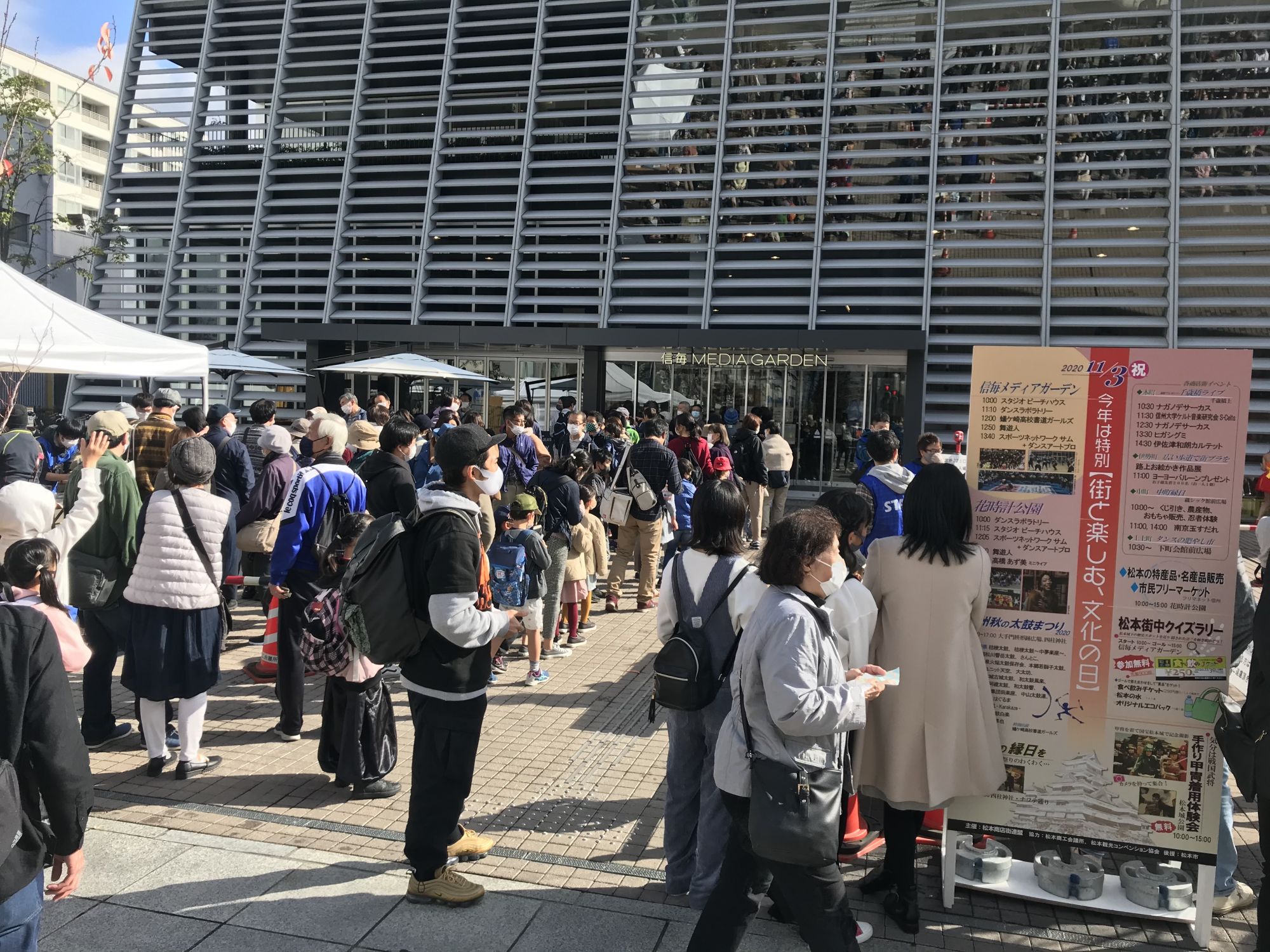 На площадке перед зданием Media Garden желающие могли получить программу праздника с расписанием и местом прохождения мероприятий . 200 первых счастливчиков в подарок к программе получили эко-сумку и бутылку питьевой воды из рук прошлогодней и нынешней мисс Мацумото. С утра здесь же выступали детские и молодежные танцевальные студии, а после полудня старшеклассники продемонстрировали написание иероглифов гигантской кистью.