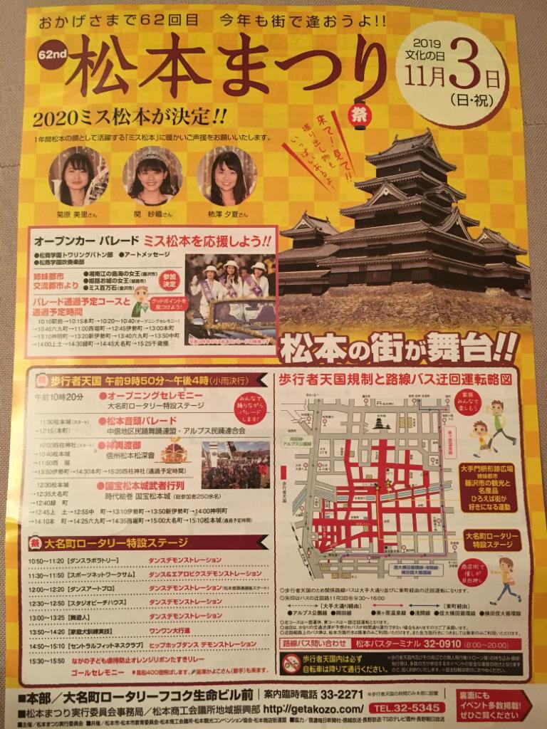 Каждый уважающий себя город Японии обязательно имеет свой собственный фестиваль. Мацумото не исключение, здешний фестиваль традиционно проходит в первые выходные ноября. В этом году мероприятие проводилось уже в 62 раз и выпало на воскресенье, 3 ноября.